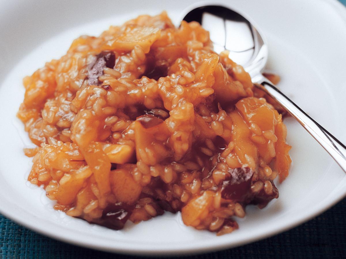 Pilko sekahedelmät pieniksi paloiksi ja keitä vedessä noin 15 minuuttia. Lisää joukkoon puuroriisi. Anna kiehua hiljalleen reilu puoli tuntia. Mausta sokerilla. Saosta sitruunamehuun sekoitetulla perunajauholla. Tarjoa puuro haaleana kylmän maidon kanssa.