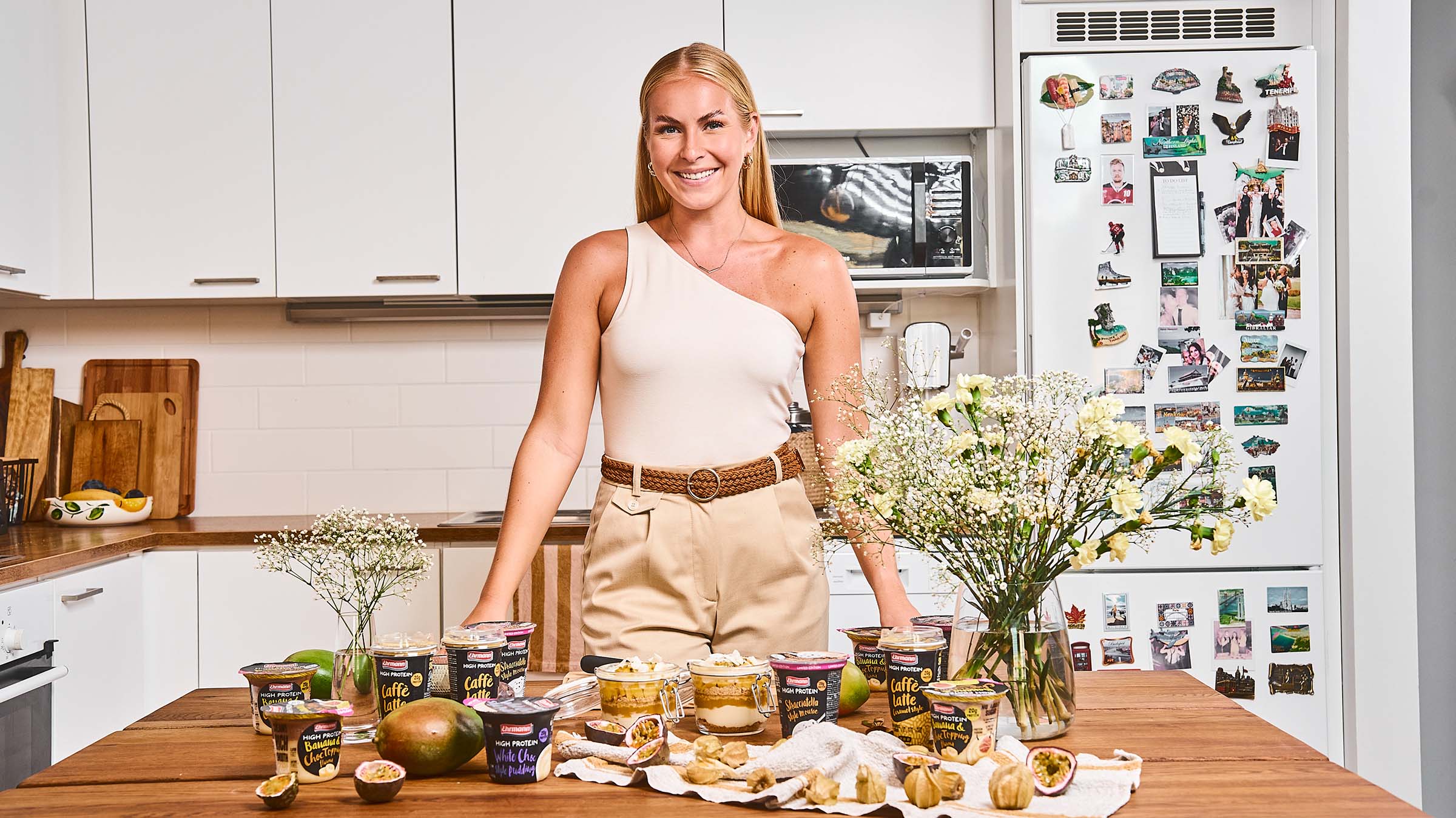 Elämässä kuuluu olla makua – myös kiireisen arjen keskellä. Alina Voronkovan luottoherkussa maistuvat valkosuklaa, rapea Digestive-keksi ja raikkaat hedelmät. Näyttävän kerrosherkun pääaineksena on Ehrmannin valkosuklaanmakuinen High Protein -vanukas, jossa on 20 grammaa proteiinia. Vanukkaassa ei ole gluteenia, eli jälkiruoasta on helppo tehdä myös gluteeniton versio.