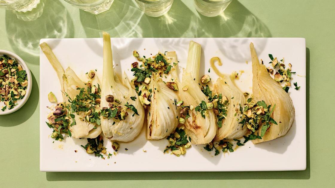 Fänkål som långsamt tillagats i vitt vin är en festlig förrätt eller ett elegant tillbehör till exempelvis fisk. Rätten toppas med ett krispigt pistagecrumble smaksatt med persilja och citronskal.
