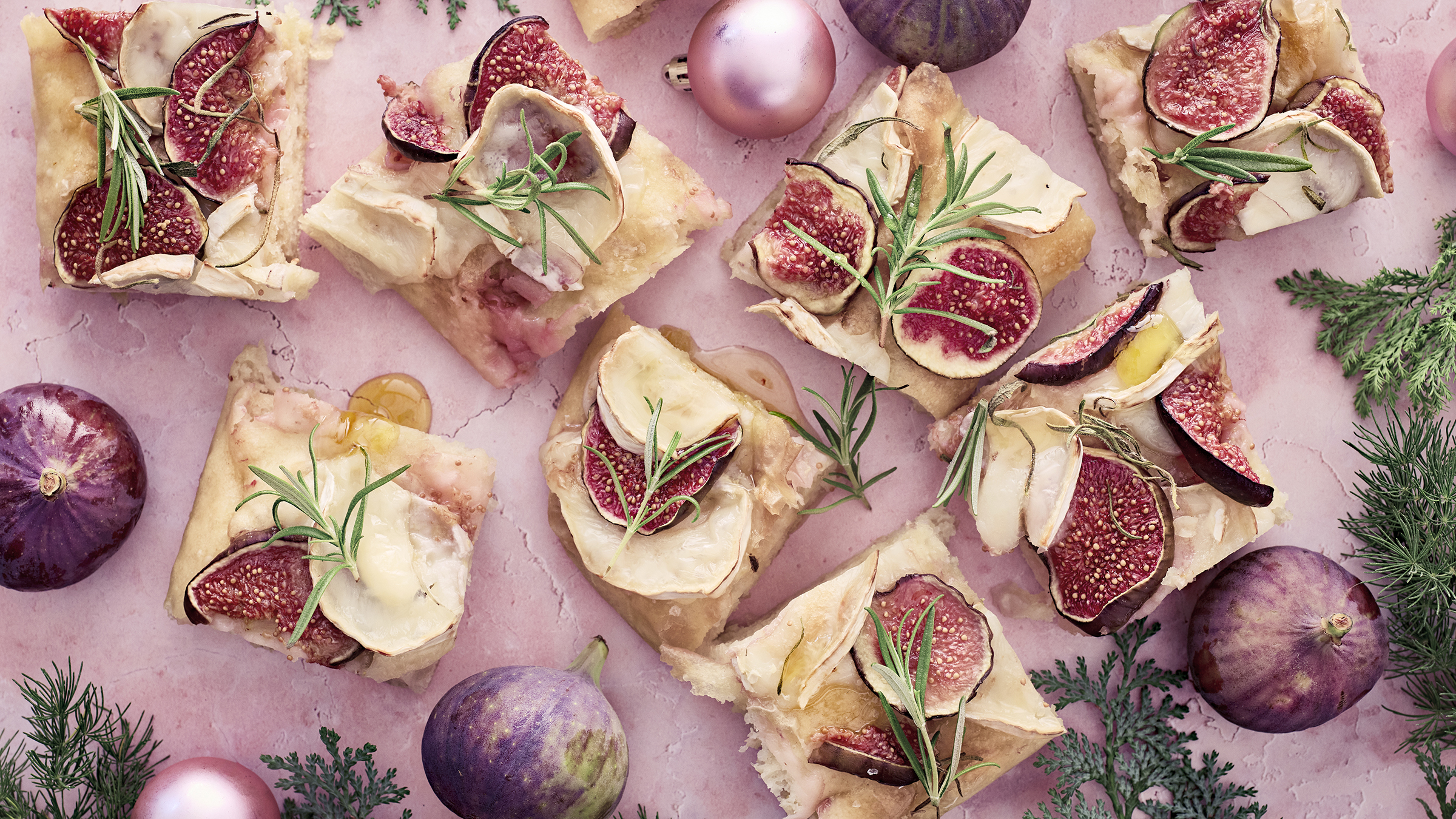 Focaccia is easy to make without kneading by letting it rise overnight. Decorate your favourite bread for Christmas with figs, goat cheese, rosemary and honey.