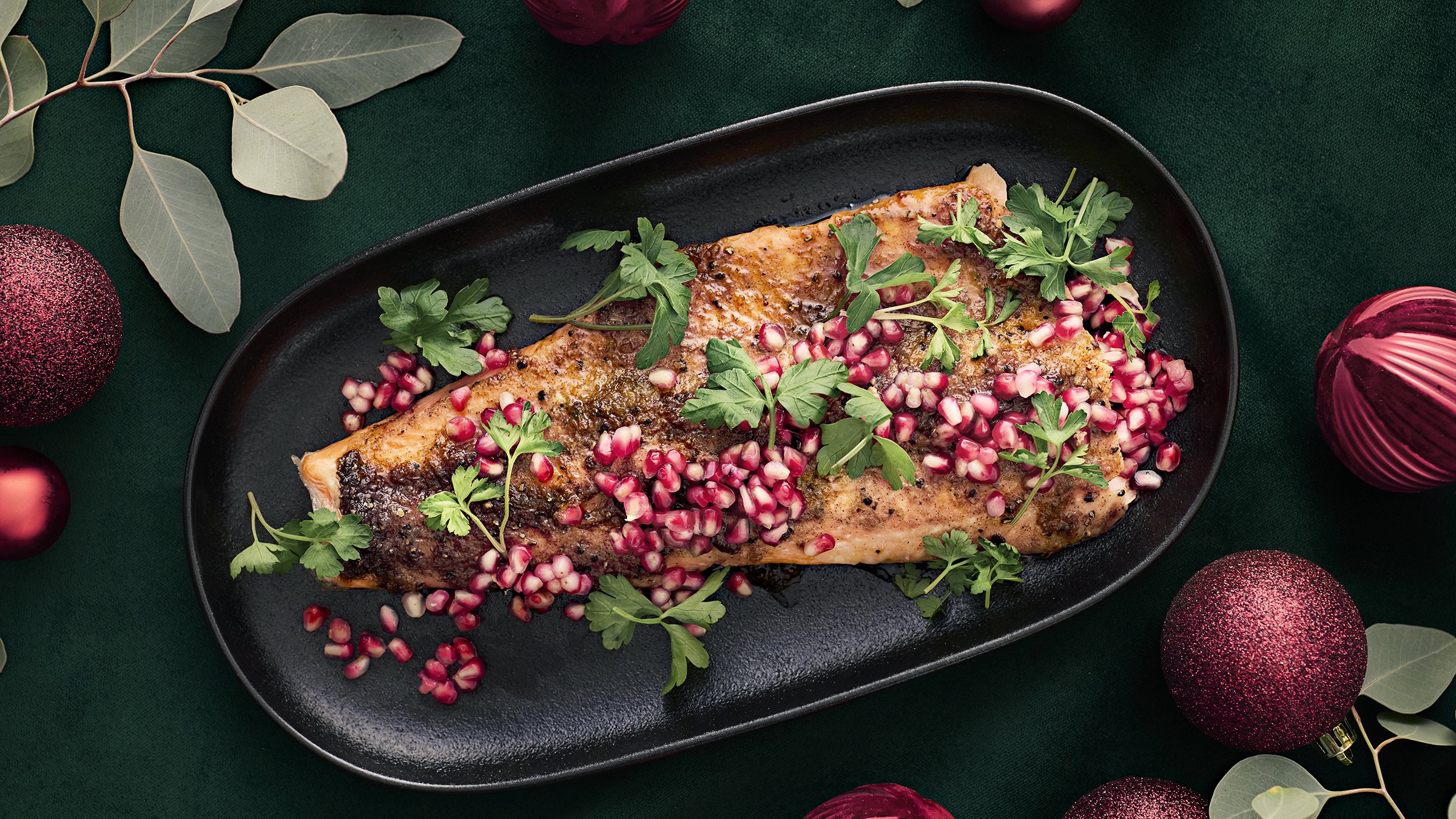 Cut the pomegranate in half and remove the seeds into a bowl by tapping the peel of the fruit with a ladle. Mix the juice with the seeds. Finish the salmon with pomegranate and flat-leaf parsley.
