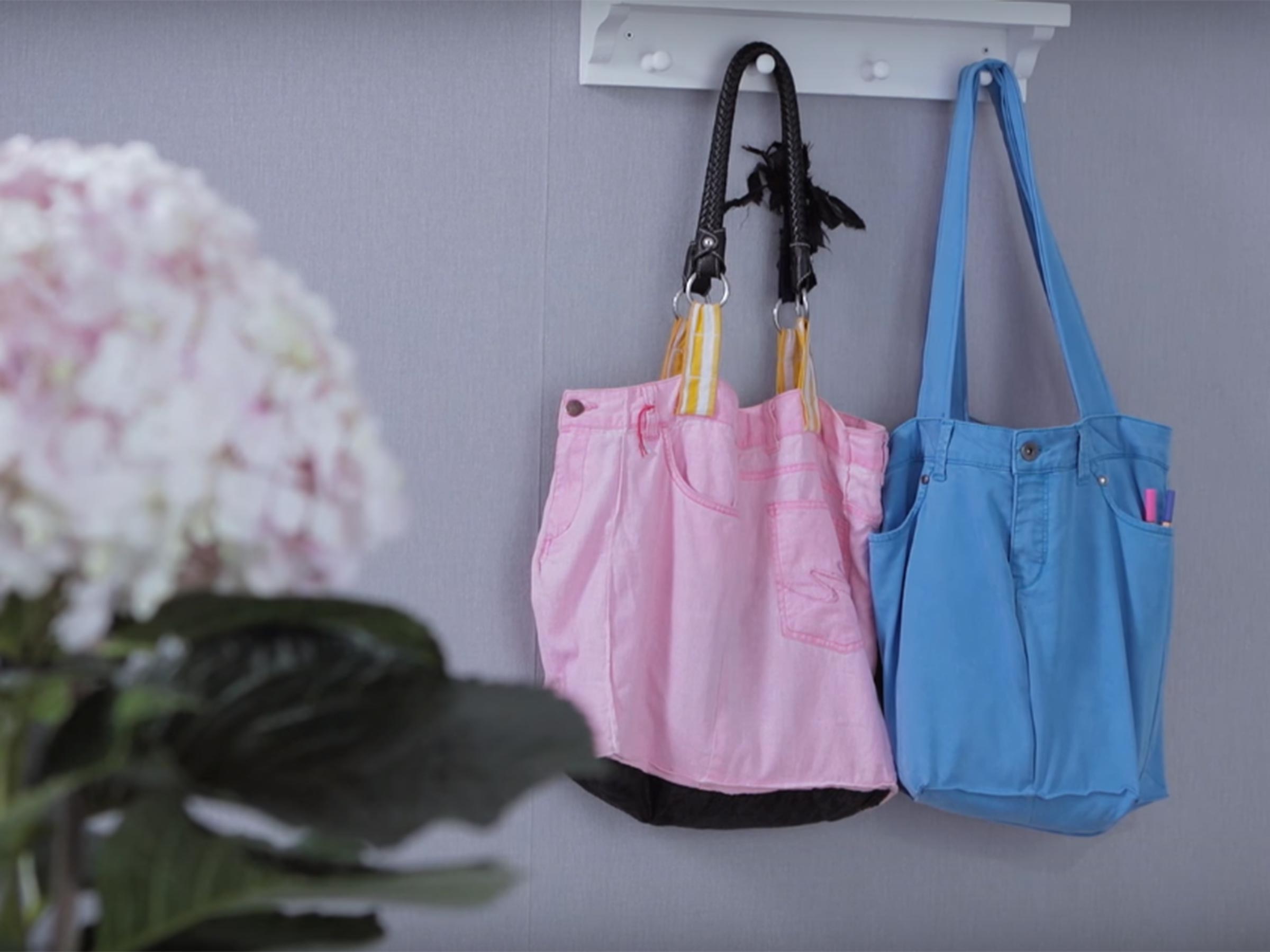 Hauska kesäkassi syntyy vanhoista housuista ompelukonetta apuna käyttäen. Kassin kahvat ommellaan housunlahkeista tai kierrättämällä vanhasta käsilaukusta.