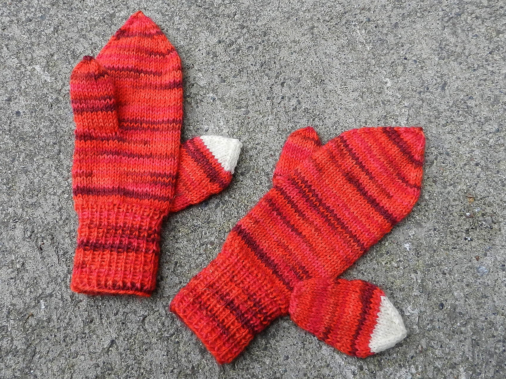 Luo punaisella langalla 36(40)s ja jaa silmukat tasan neljälle puikolle. Kerroksen vaihtumiskohta on 1. ja 4. puikon välissä. Neulo 1 o, 1 n -joustinneuletta suljettuna neuleena 5(5) cm. Neulo sitten sileää neuletta 4(5) cm. Tee seuraavalla kerroksella peukalonkohta: Neulo 1. puikon alusta 6(8)s erivärisellä apulangalla. Siirrä silmukat takaisin vasemmalle puikolle ja neulo punaisella langalla kaikki 1. puikon silmukat. Neulo sileää neuletta 6(7) cm ja aloita kärkikavennukset. Neulo 1. ja 3. puikon alussa 1 o, ylivetokavennus, ja 2. sekä 4. puikon lopussa, kun jäljellä on 3 silmukkaa, 2 s o yhteen, 1 o. Toista kavennukset joka toinen kerros, kunnes jäljellä on yhteensä 8 s. Katkaise lanka ja vie se silmukoiden läpi.