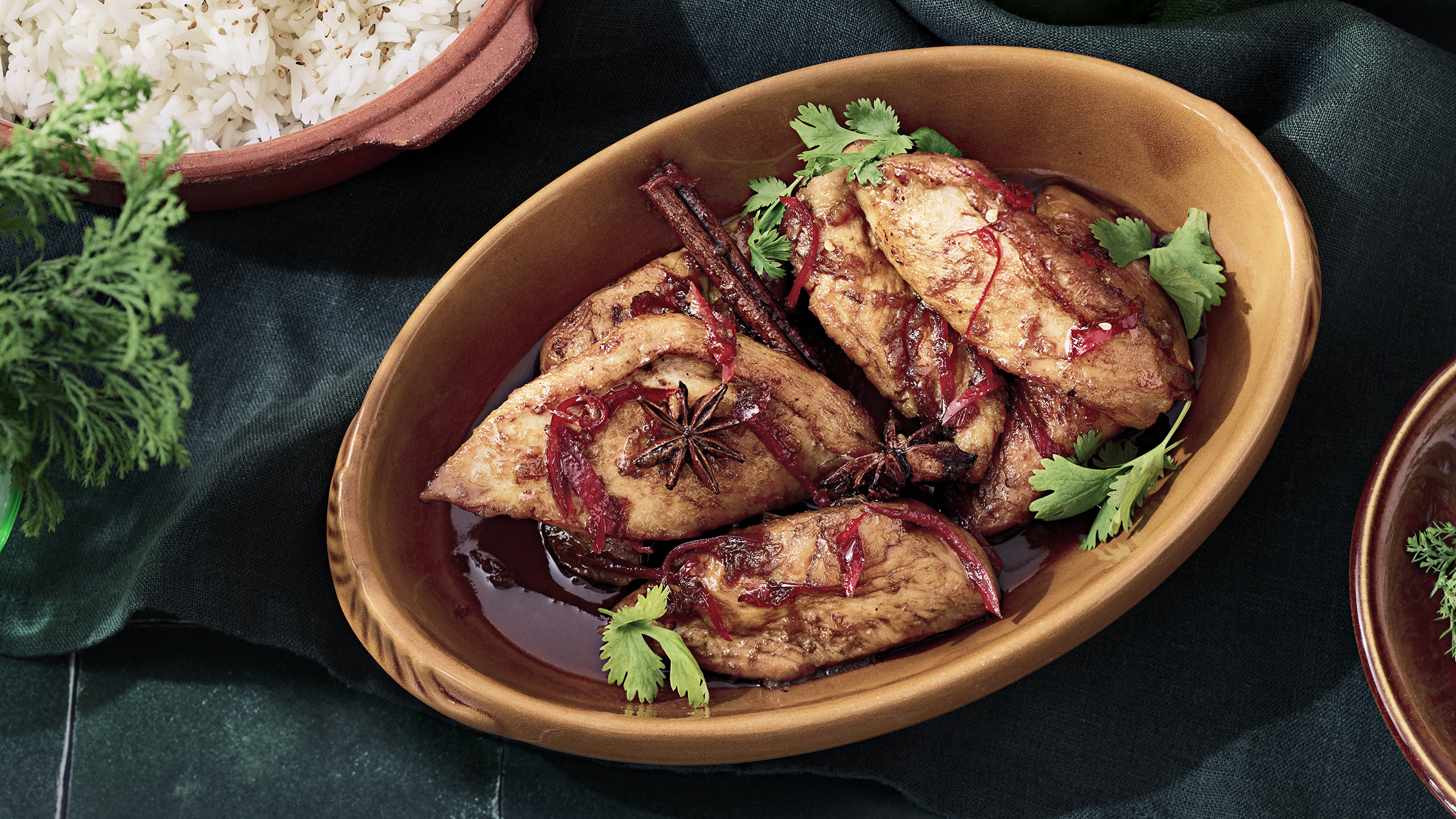 Såsen till denna kyckling har en läcker sötma och får smak av ingefära, stjärnanis och kanelstång. Servera den karamelliserade kycklingen med jasminris och grönsaker.
