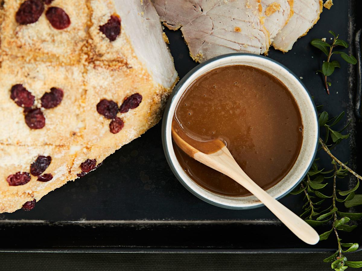Perinteinen joulukinkun kastike on Yhteishyvän ikisuosikki. Tuunaa reseptiä ja valmista kirsikkakastike, wasabi-hunajakastike tai miso-voikastike. Löydät tuunausohjeet reseptin yhteydestä.