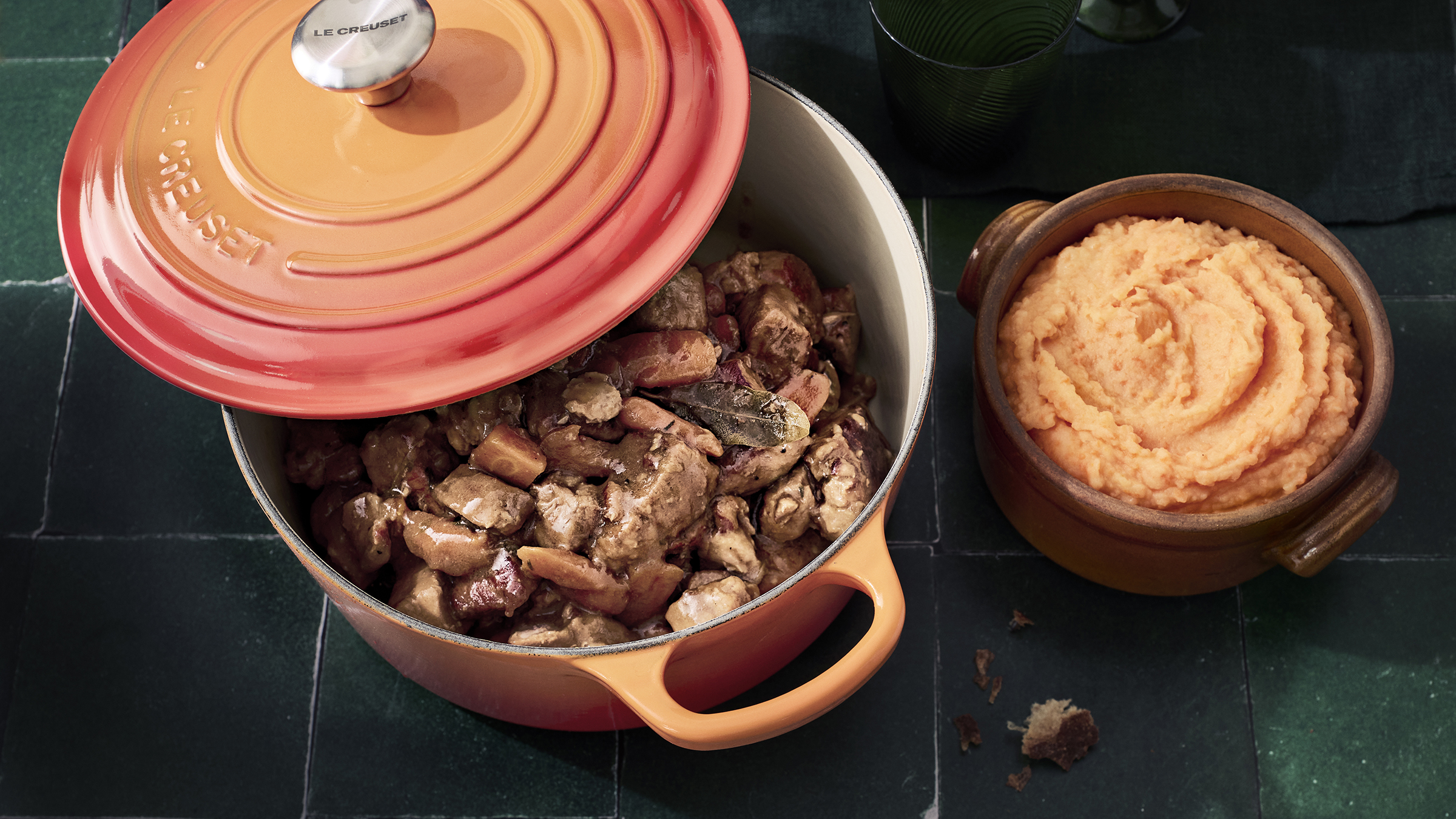 Denna grisköttsgryta blir mör då den får puttra för sig själv i ugnen. Hemligheten bakom såsens utsökta smak är mörkt öl.
