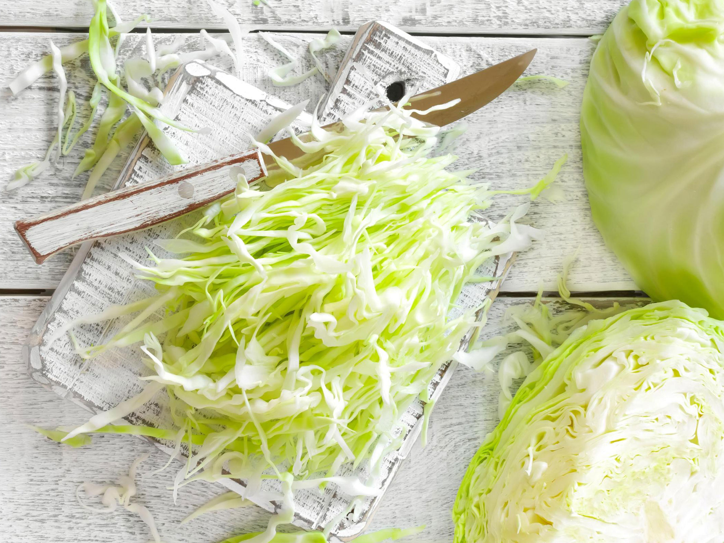 Kotona tarvitset ison terävän veitsen ja leikkuualustan. Tehtäväsi on ensin puolittaa varhaiskaali ja sitten leikata se todella ohuiksi suikaleiksi (ei aivan hakkelukseksi).
