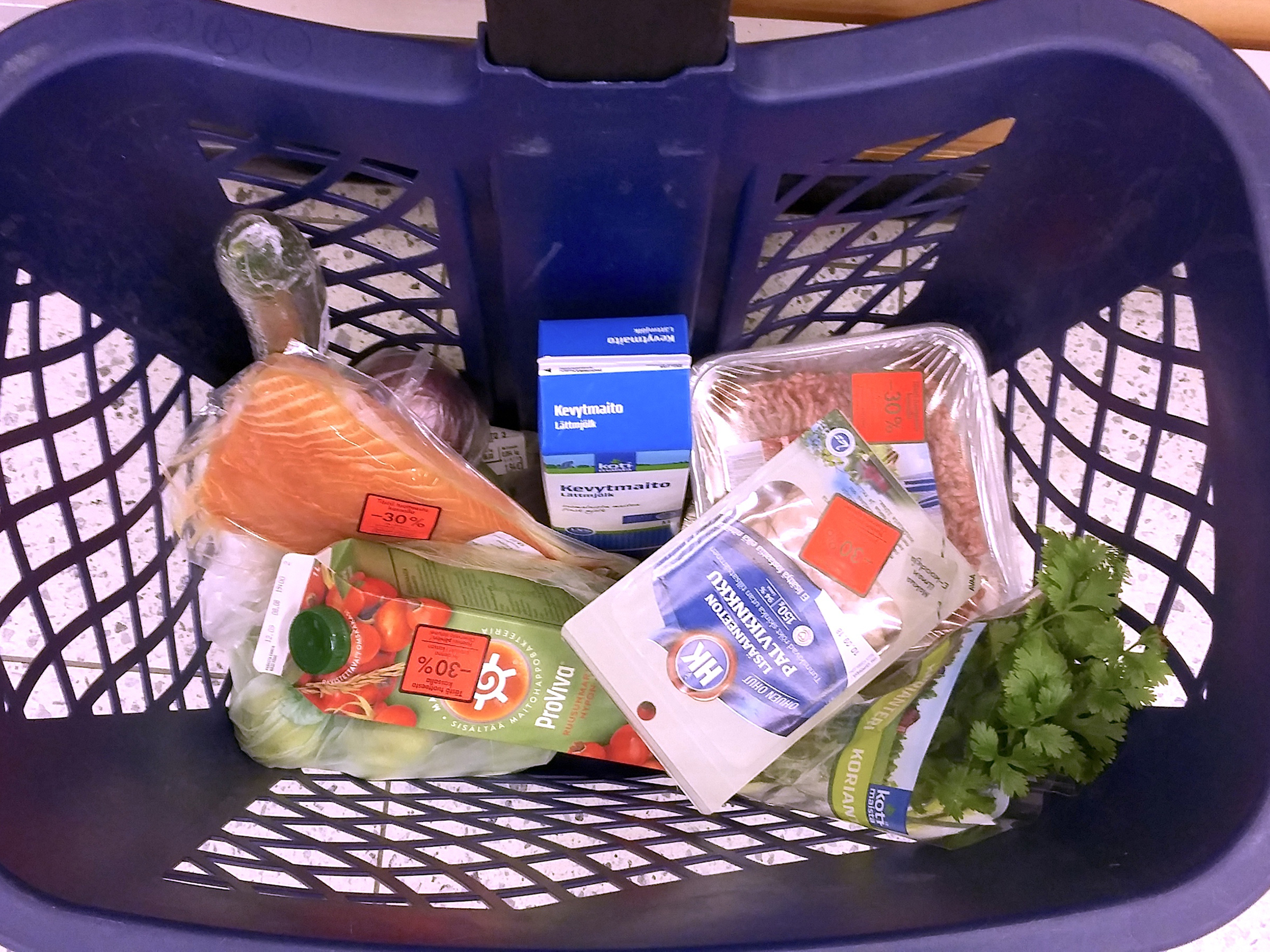S-marketissa ollaan juuri hyllyttämässä uutta kuormaa ja rullakoiden kimpussa on viisi työntekijää. Punalaputettuina on tarjolla 30 prosentin alennuksella porsaan fileetä, naudan paistia, broilerin siipiä marinadissa ja maustamattomia rintapaloja, lohta ja savukalaa. Menen vähän päästäni pyörälle, kun tekisi mieli ostaa kärry täyteen.