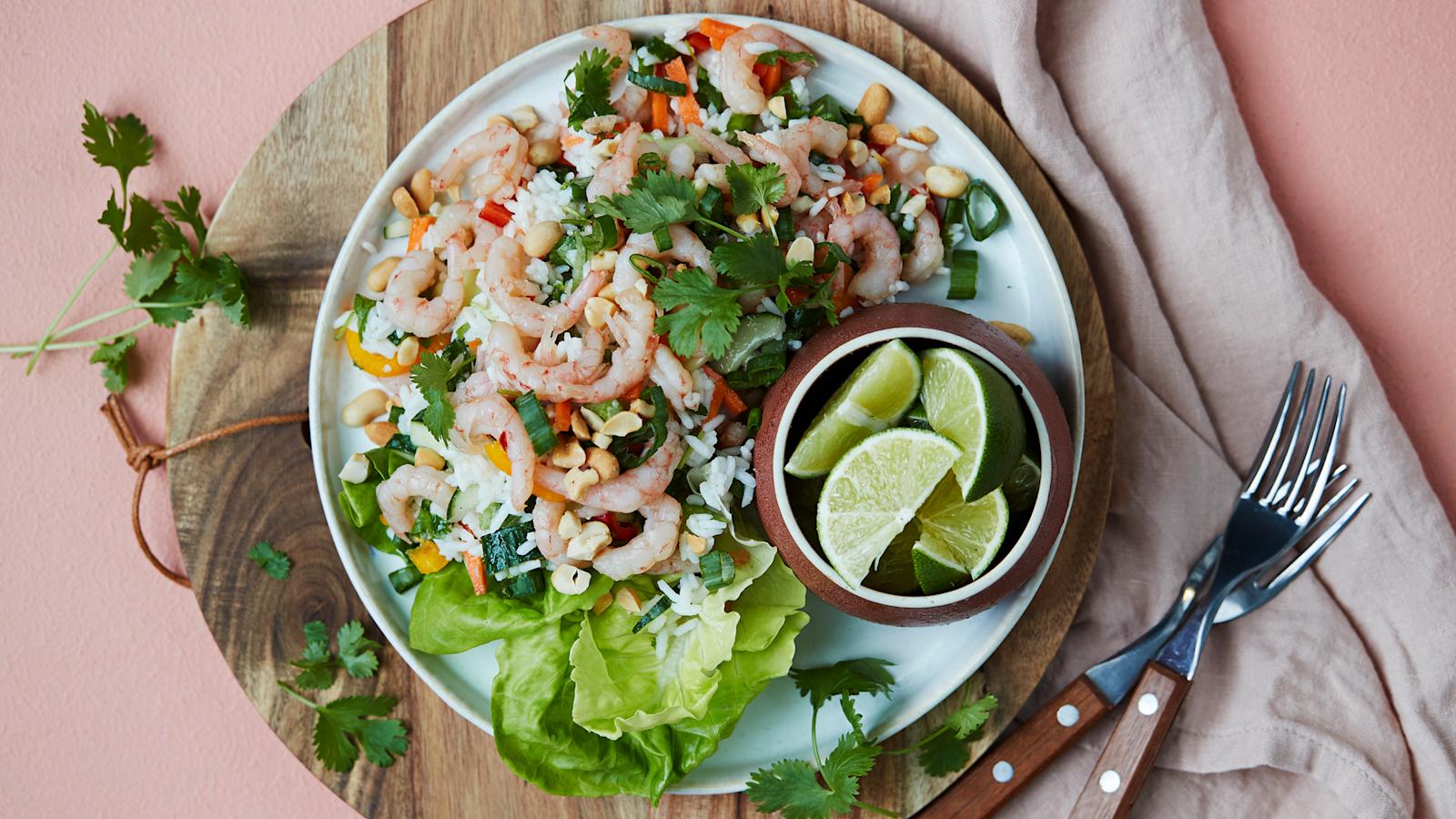 Riisistä, porkkanasta, paprikasta ja kurkusta sekoitetussa katkarapusalaatissa maistuvat thaimaalaisesta ruoasta tutut mausteet. Kevyt salaatti sopii salaattibuffettiin yhdeksi muiden salaattien kanssa.