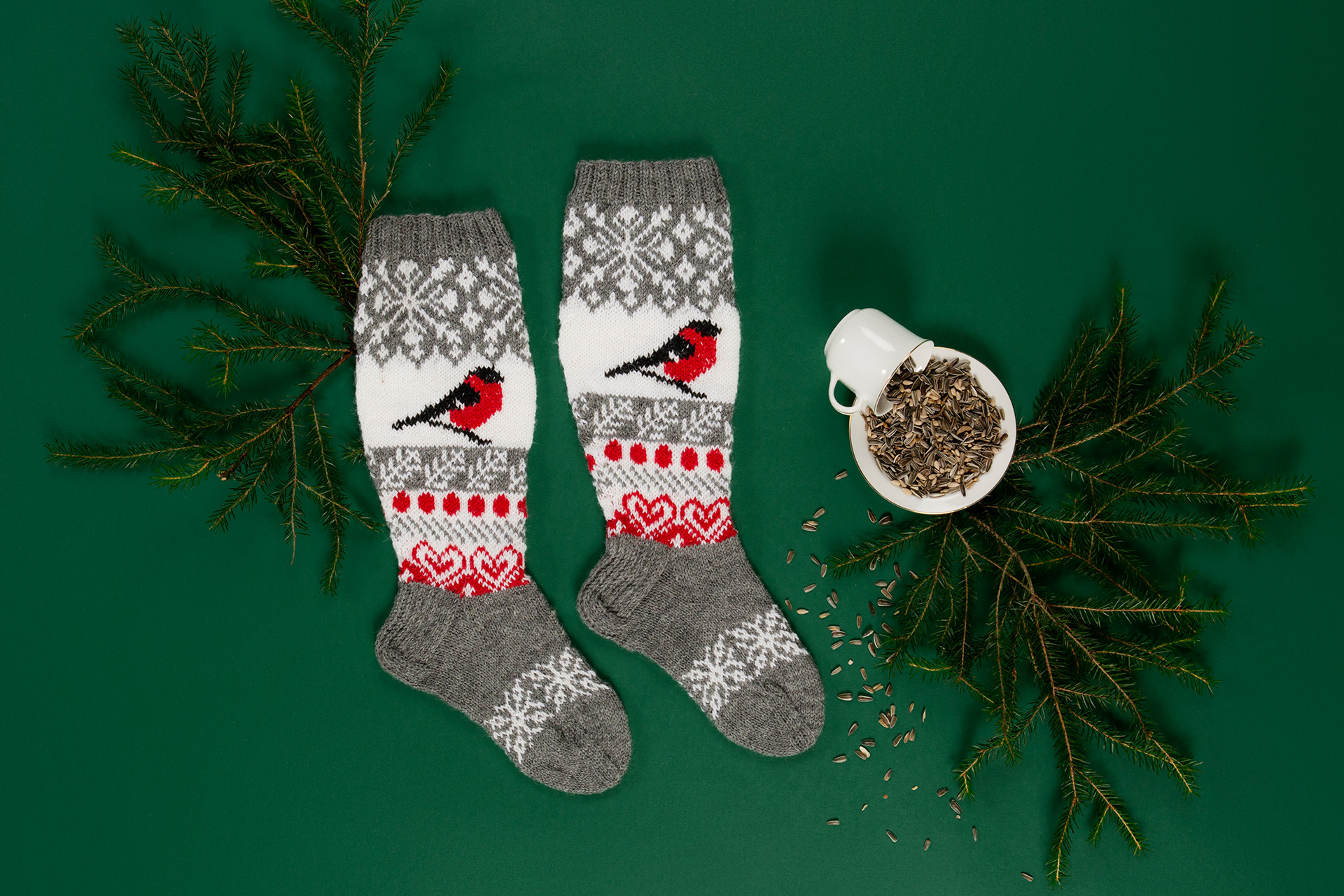 I Kymmenedalens landskapssockor bröstar sig domherren, som är en vanlig gäst på gårdstunen vintertid. Bland de sköra snöflingorna och risen ser vi också ett löfte om den annalkande julen.