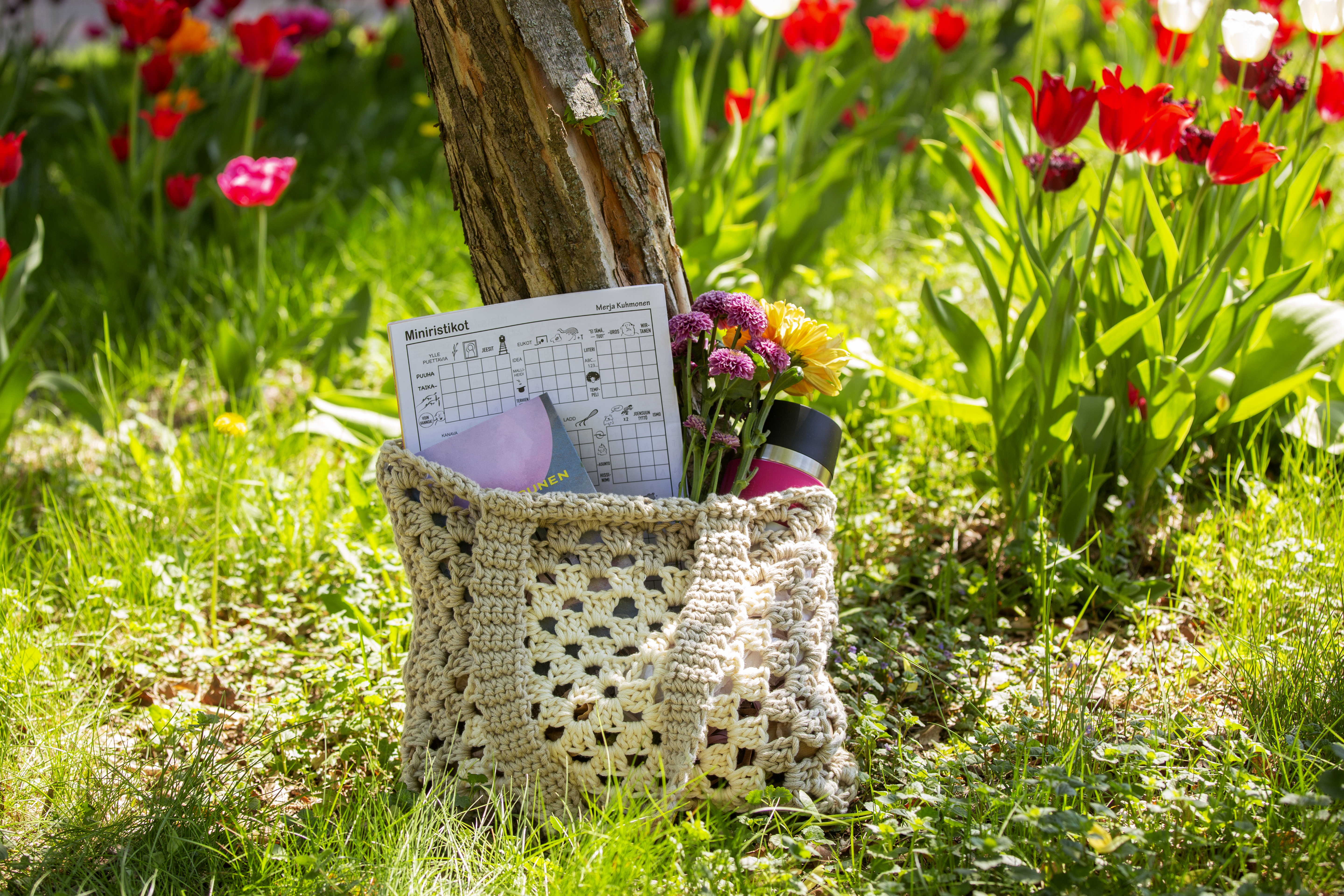 5.krs: Tee 3 kjs (= kerroksen 1. pylväs). Tee 2 p ensimmäisen edellisen kerroksen kjs:n ympäri, 1 kjs. Tee neliön sivuissa olevien ketjusilmukoiden ympäri 3 p + 1 kjs ja kulmissa oleviin kjs-kaariin 3 p + 3 kjs + 3 p + 1 kjs. Virkkaa näin kerroksen loppuun. Jos haluat vaihtaa väriä, kuten mallikassissa, ota uusi väri työhön tässä vaiheessa: sulje krs uudella värillä ps:lla kerroksen alun 3:nteen kjs:aan. Katkaise vanha lanka.