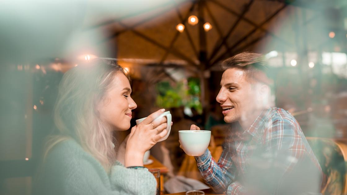 Pariskunta istuu kahvikupin ääressä ja katsoo toisiaan.