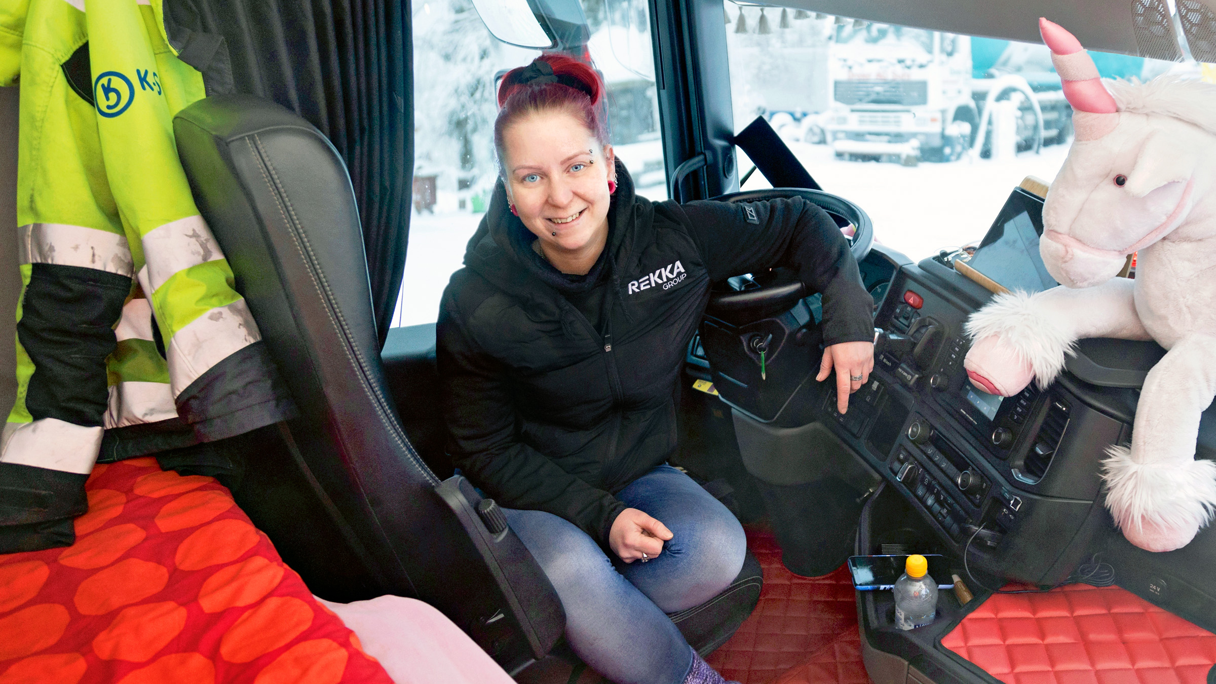 Muutaman vapaapäivän jälkeen Jenni kaipaa jo takaisin tien päälle. Rekassa on aina mukana Hillevi, yksisarvinen pehmolelu. Se on tehnyt Jennin kanssa matkaa jo miljoonan kilometrin verran.