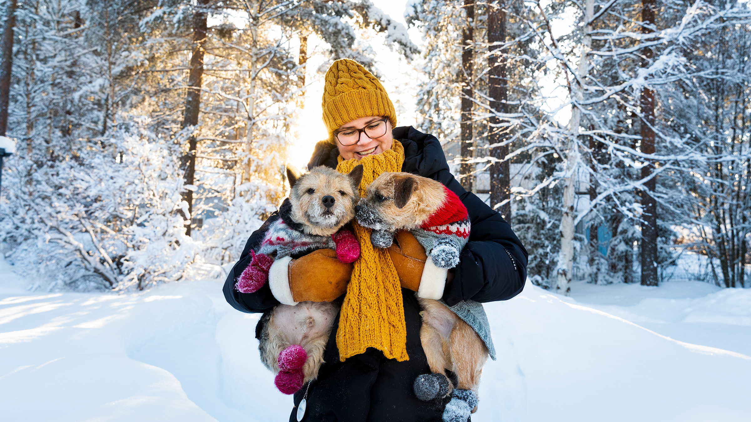 Katin molemmilla koirilla on ohuet villatakit kevyempään talvisäähän ja paksut islantilaisneuleet koviin pakkasiin. Lyhytkarvainen Otto tarvitsee neuleen päälleen myös kovalla tuulella ja vanha herra Eppu suojataan erityisellä rakkaudella.