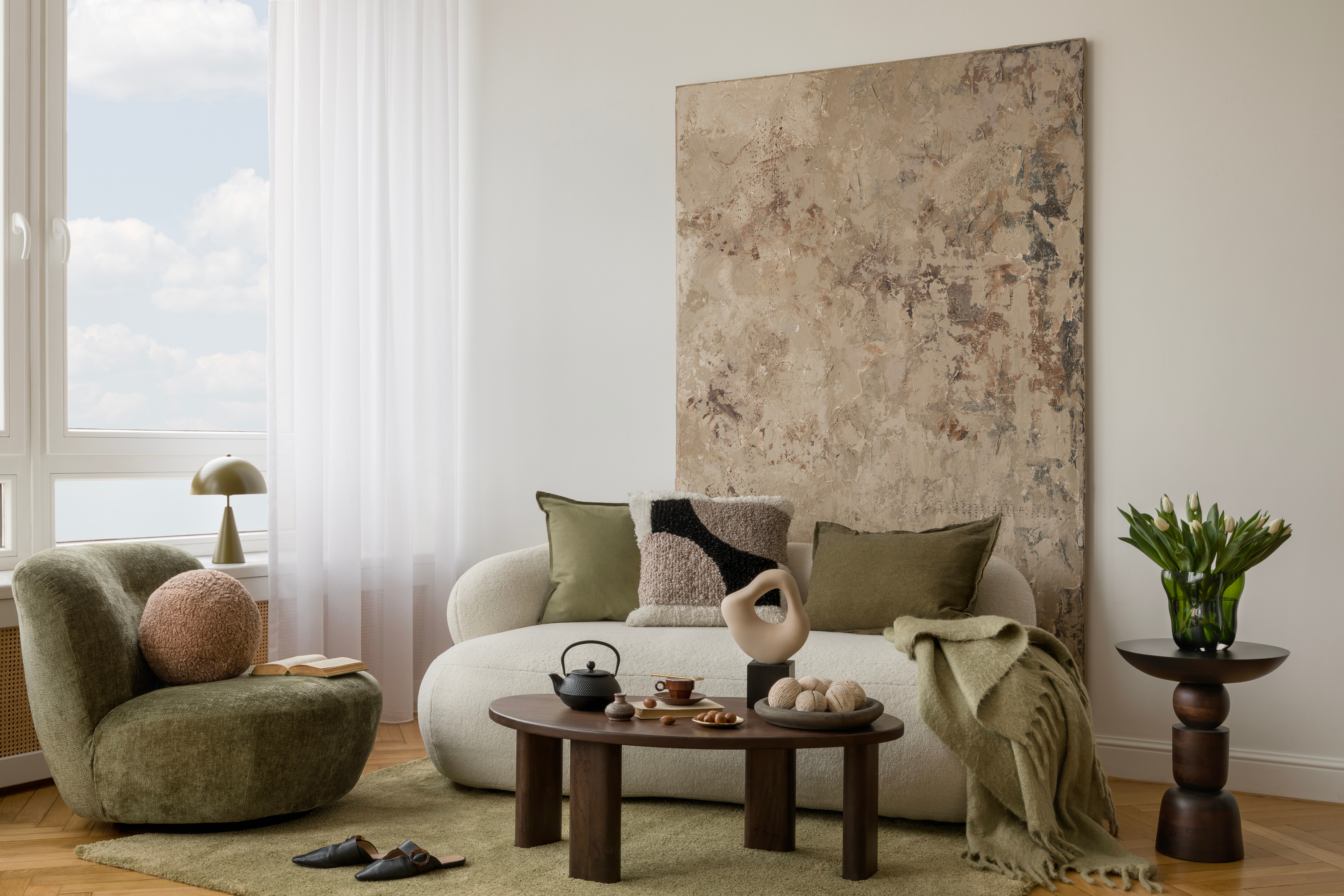 Se toimii suurina pintoina, kuten seinissä, kaapistoissa ja ovissa, mutta loistaa myös yksityiskohdissa. Oliivinvihreä nojatuoli, kaunis maljakko tai pehmeä villamatto voi tuoda tilaan juuri sopivasti luonnetta ilman suuria remontteja.