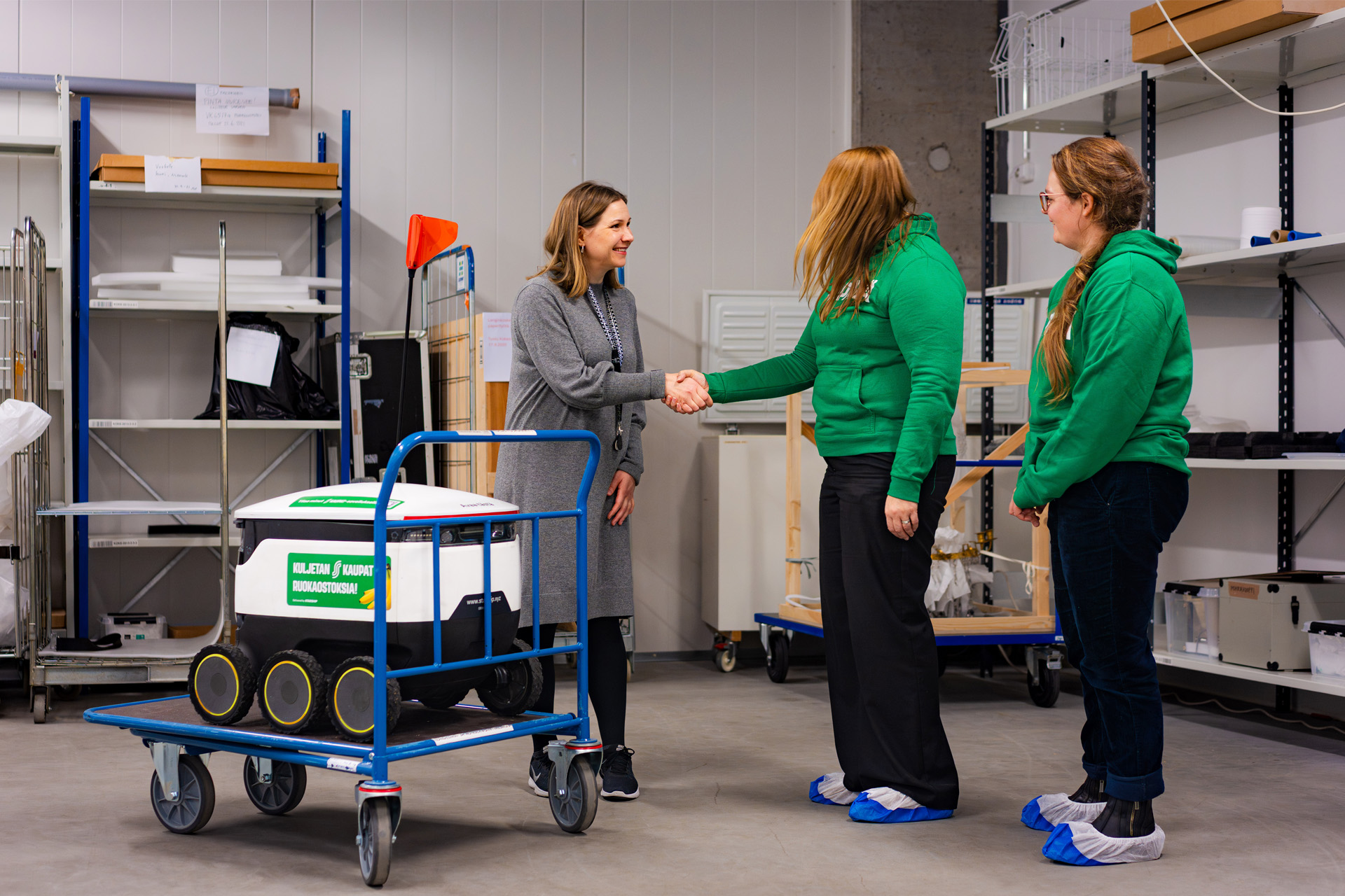 Katukuvasta tutuksi tullut valkoinen robotti nostetaan työntölavalle ja kuljetetaan sisätiloihin. Ruoan verkkokaupan kehityksestä vastaava Emilia Ala-Kurikka ja pikatoimitusten kehittämisestä vastaava Iona Maaranto luovuttavat tuhansia kilometrejä kulkeneen ruokarobotin Suomen kansallismuseon intendentti Maria Ollilan haltuun.