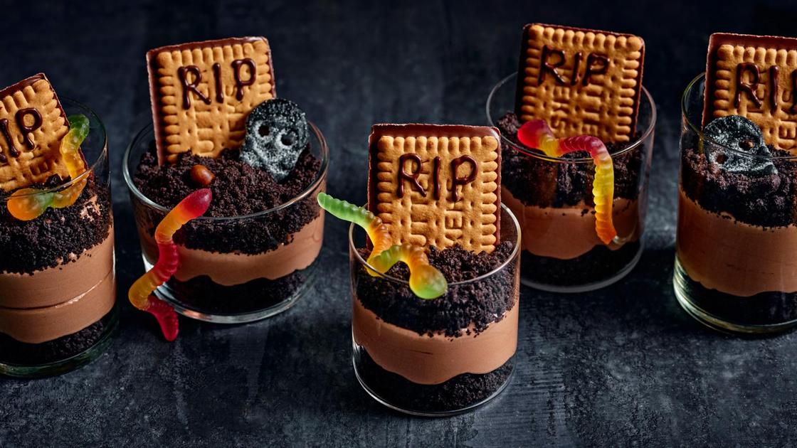 Mitä mullan seasta pilkistää? Halloweenin hurjin herkku on näppärä suklaamousse, joka saa pinnalleen tummista täytekekseistä murusteltua multaa, keksiset hautakivet ja maan alta kiemurtelevia karkkimatoja ja -toukkia. Kokoa mousse yksittäisiin pienempiin annosmaljoihin tai rakenna iso hautausmaa yhteen isoon kulhoon.