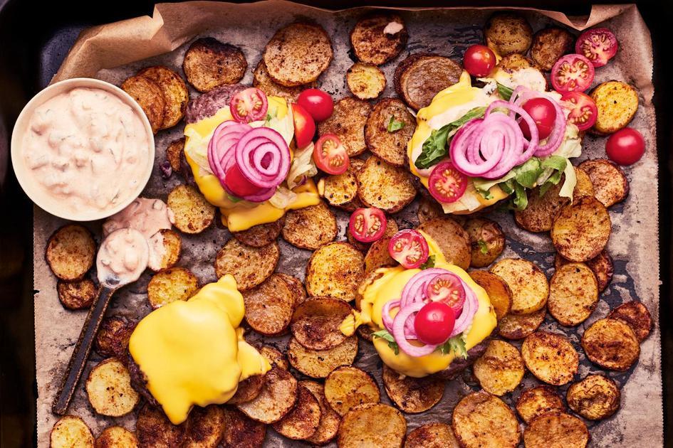 Myös burgeri-perunapelti maistuu hampurilaisten ystäville. Tässä versiossa pihvien kanssa nautitaan hampurilaissämpylän sijasta perunaviipaleita! Pihvitkin kypsennetään kätevästi uunissa ja pelti viimeistellään burgereista tutuilla täytteillä.