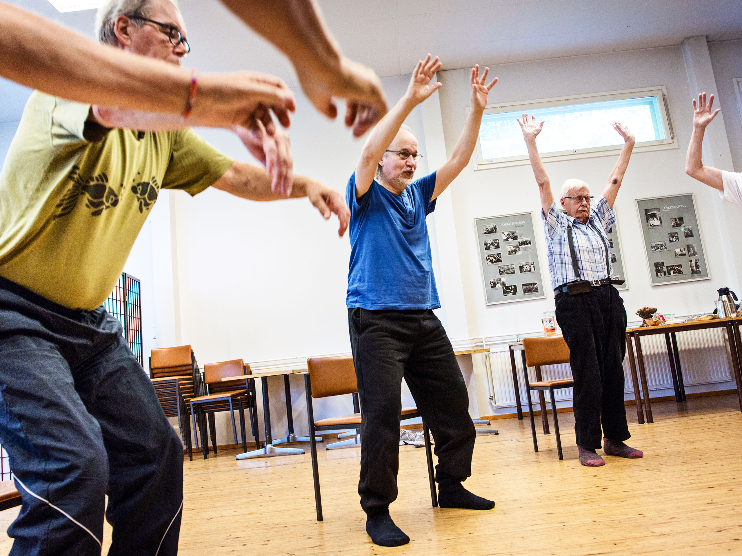 Antero, 66, nyökyttelee vieressä. Hän uskaltautui aikoinaan joogaamaan, koska kellonaika sopi muuhun elämään ja matkakin oli helppo taittaa.