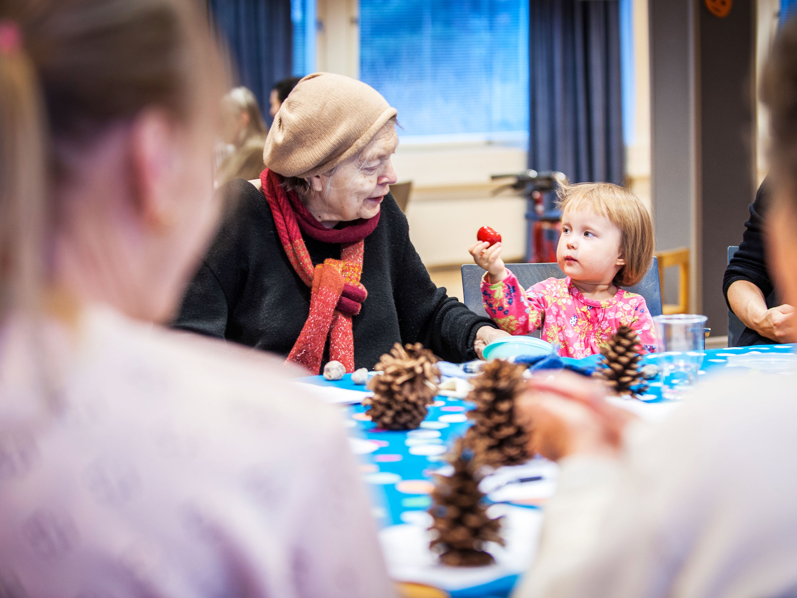 Terhokerhossa lapset voivat nauttia mummojen ja pappojen sekä muiden aikuisten kiireettömästä huomiosta. Tästä pääsee osalliseksi myös Iida, jonka oma mummo asuu viiden tunnin automatkan päässä. Sirkka Laakkonen istuu alas Iidan kanssa katsomaan kuvakirjaa.
