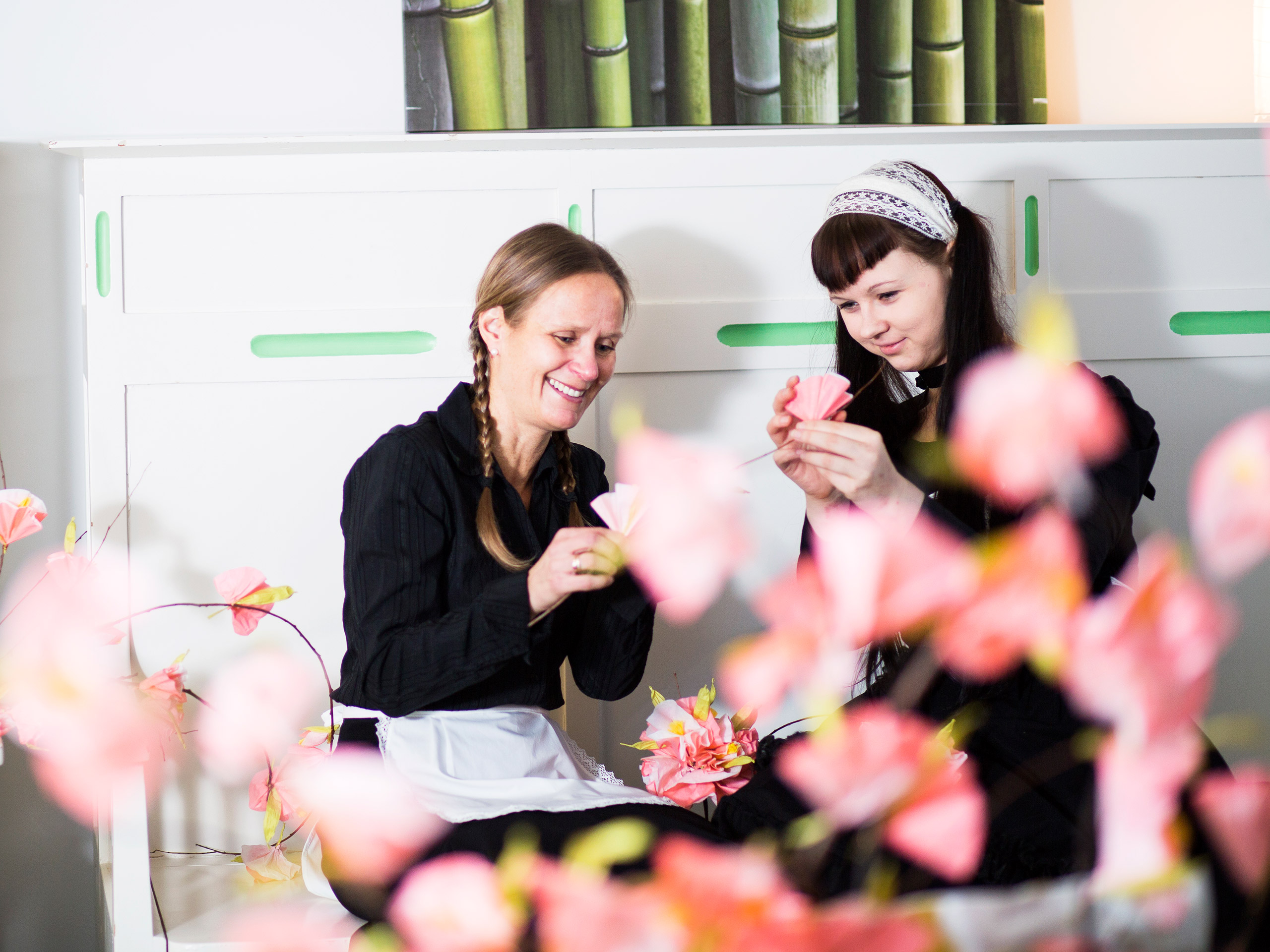 Kirsikankukat, askarteleminen ja pitsiesiliinat puhuttavat naisia helsinkiläisessä kerhotilassa. Minna Lahtinen, 47, ja Heini Illukka, 22, ovat suunnitelleet pitkään Japani-aiheisia juhlia, ja nyt vihdoin on aika koristella tila ja aloittaa juhliminen.