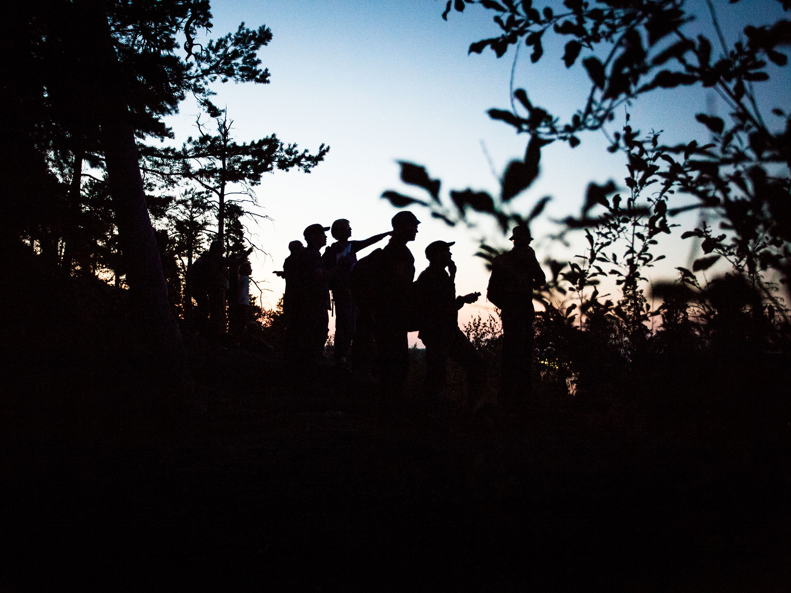 Pohjanlepakon perhosmaisen räpsyttelevä lento näkyy taivasta vasten, kun se ylittää aukean. Kymmenkunta lepakkoretkeläistä seuraa liihottelua niskat kenossa.