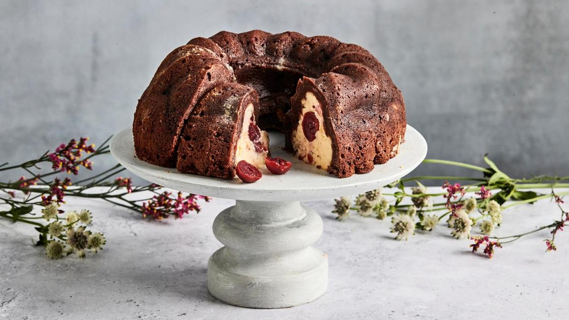 Kahvikakun näköinen upside down -kakku on todellinen yllättäjä: leikatessa suklaisen kakkukerroksen alta paljastuukin juustokakku! Tee kakku tarjoilua edeltävänä päivänä, niin kirsikkainen täyte ehtii hyytymään kunnolla.