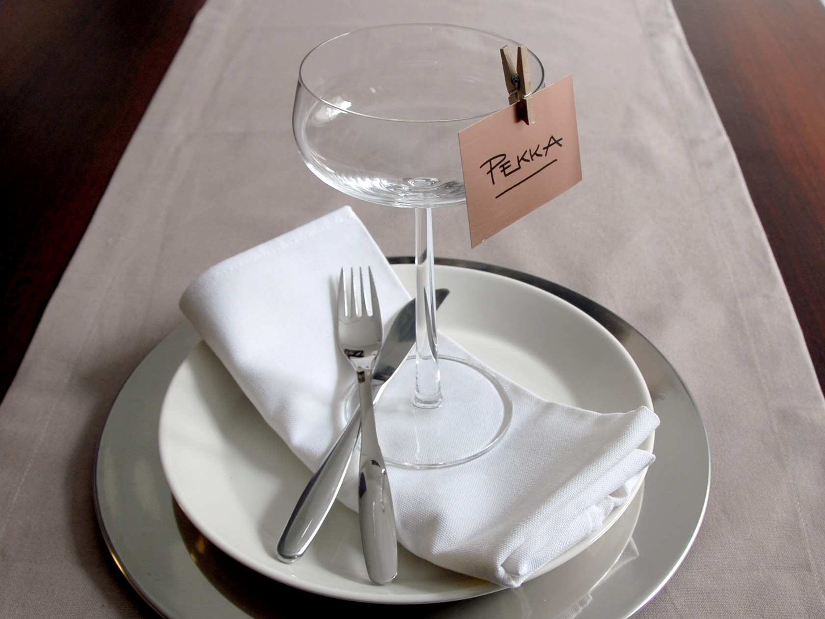 Yksinkertainen pahvikortti kiinnitetään juomalasin reunaan pienellä pyykkipojalla. Malli on helppo ja nopea, mutta tuo silti persoonallisuutta kattaukseen.
