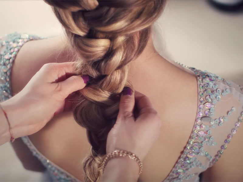 Elsan muhkea lettikampaus tehdään klipsillä kiinnitettävien hiuslisäkkeiden avulla. Kampauksen pohjaksi hiuksiin levitetään muotoilutuote ja hiukset kiharretaan lämpörullilla.