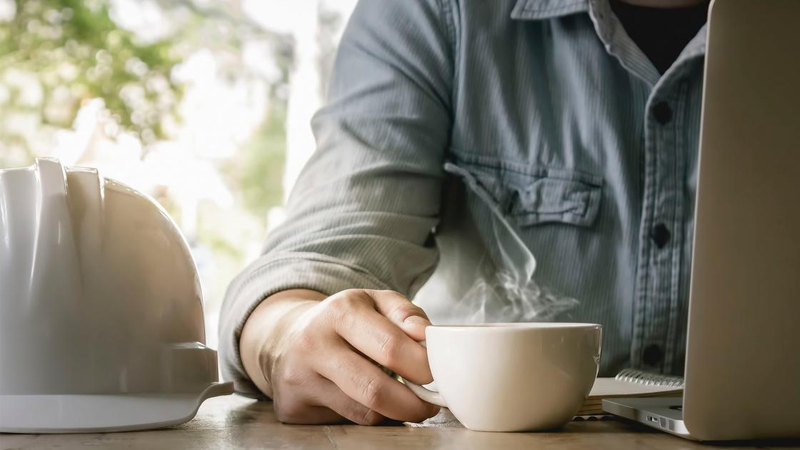 Miehen käsi pitelee kahvikuppia. Pöydällä on valkoinen kypärä ja kannettava tietokone.