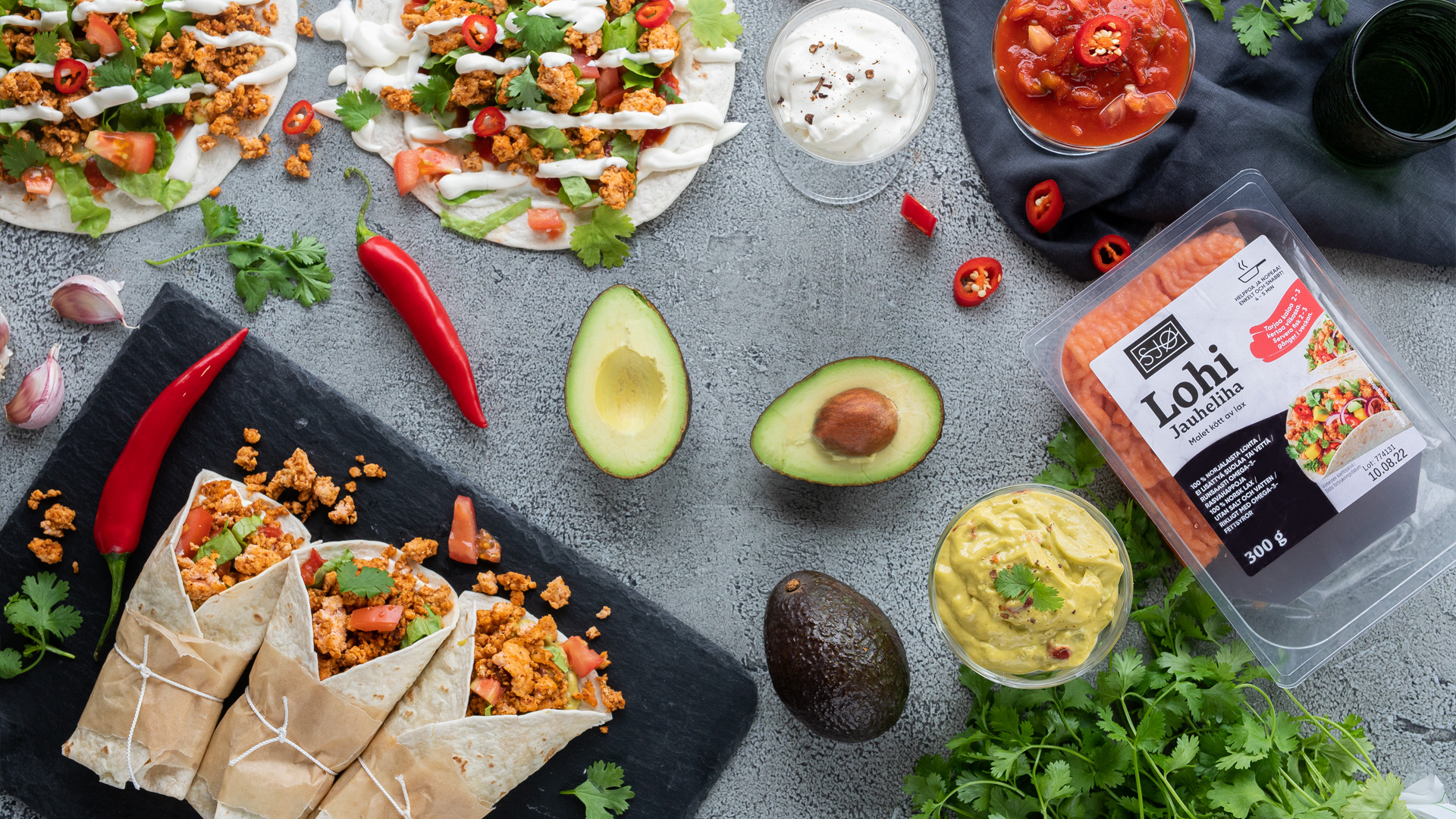 - Lämmitä tortillat uunissa tai mikroaaltouunissa. Levitä tortilloille guacamolea, ranskankermaa ja tomaattisalsaa. Lisää lohijauhelihaa, salaattia, sekä halutessasi muita täytteitä oman makusi mukaan. Tarjoile heti.