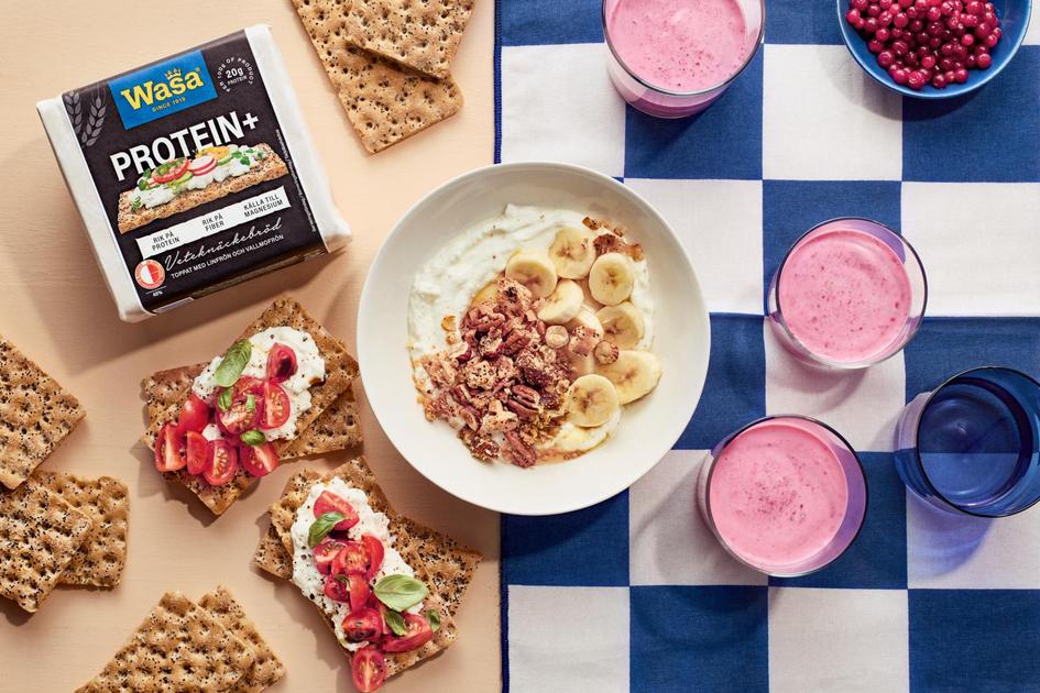 Proteiinipitoinen välipala pitää nälän loitolla. Murenna Wasa Protein+ näkkileipää smoothieen tai granolaan tai kokoa näkkärin päälle herkulliset täytteet.