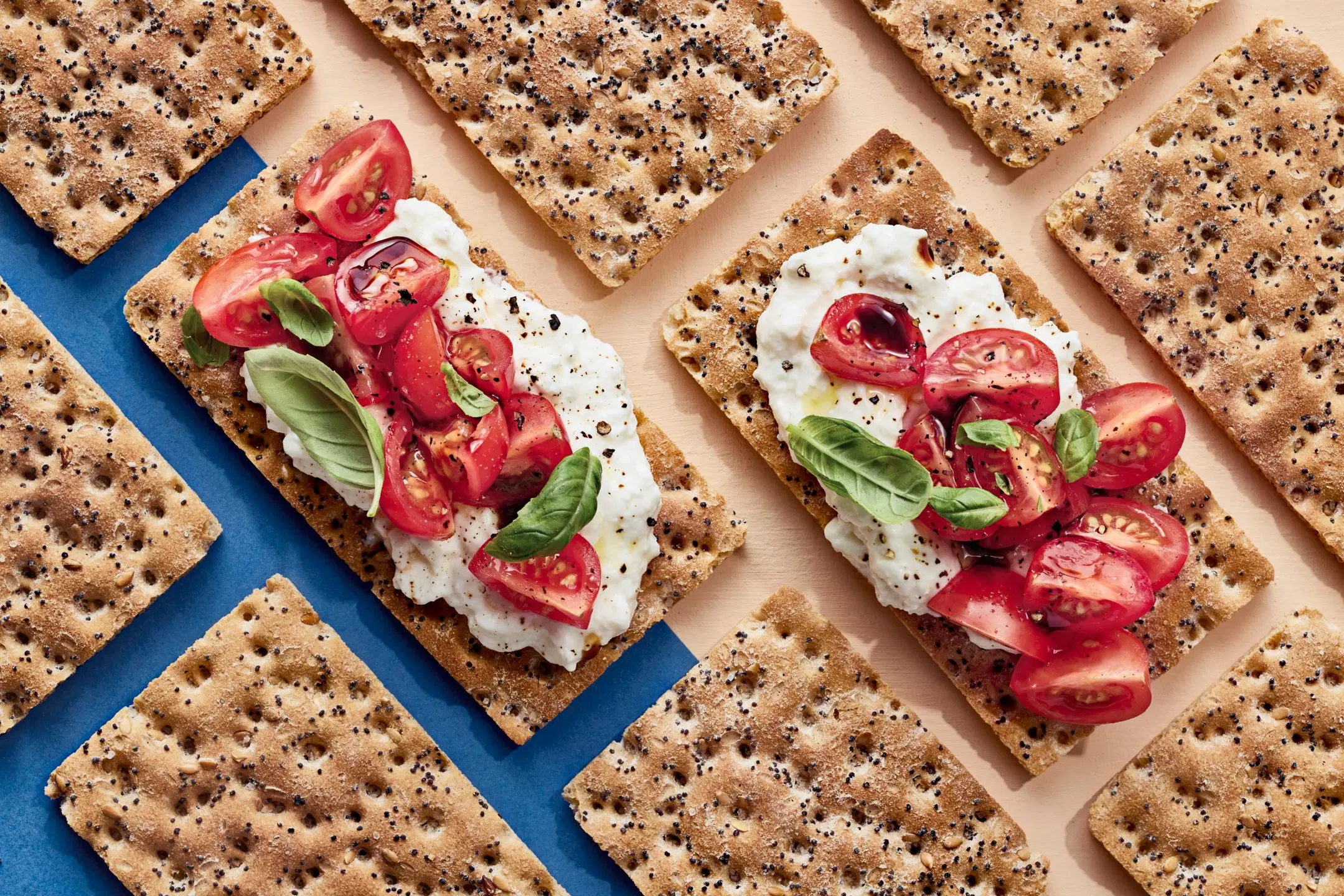 Pehmeä raejuusto levittyy sujuvasti näkkärin päälle. Balsamicolla ja basilikalla maustetut tomaattilohkot lusikoidaan päälle, jolloin kokonaisuus on runsas, raikas ja maukas.