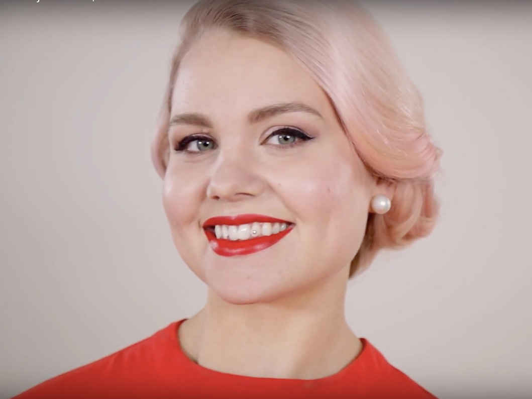 Kesäisiin juhliin oman lisäyksensä antavat näyttävä silmämeikki sekä punaiset mattahuulet. Klassinen kiharainen niskanuttura sopii juhliin tai rennompaankin tunnelmaan.