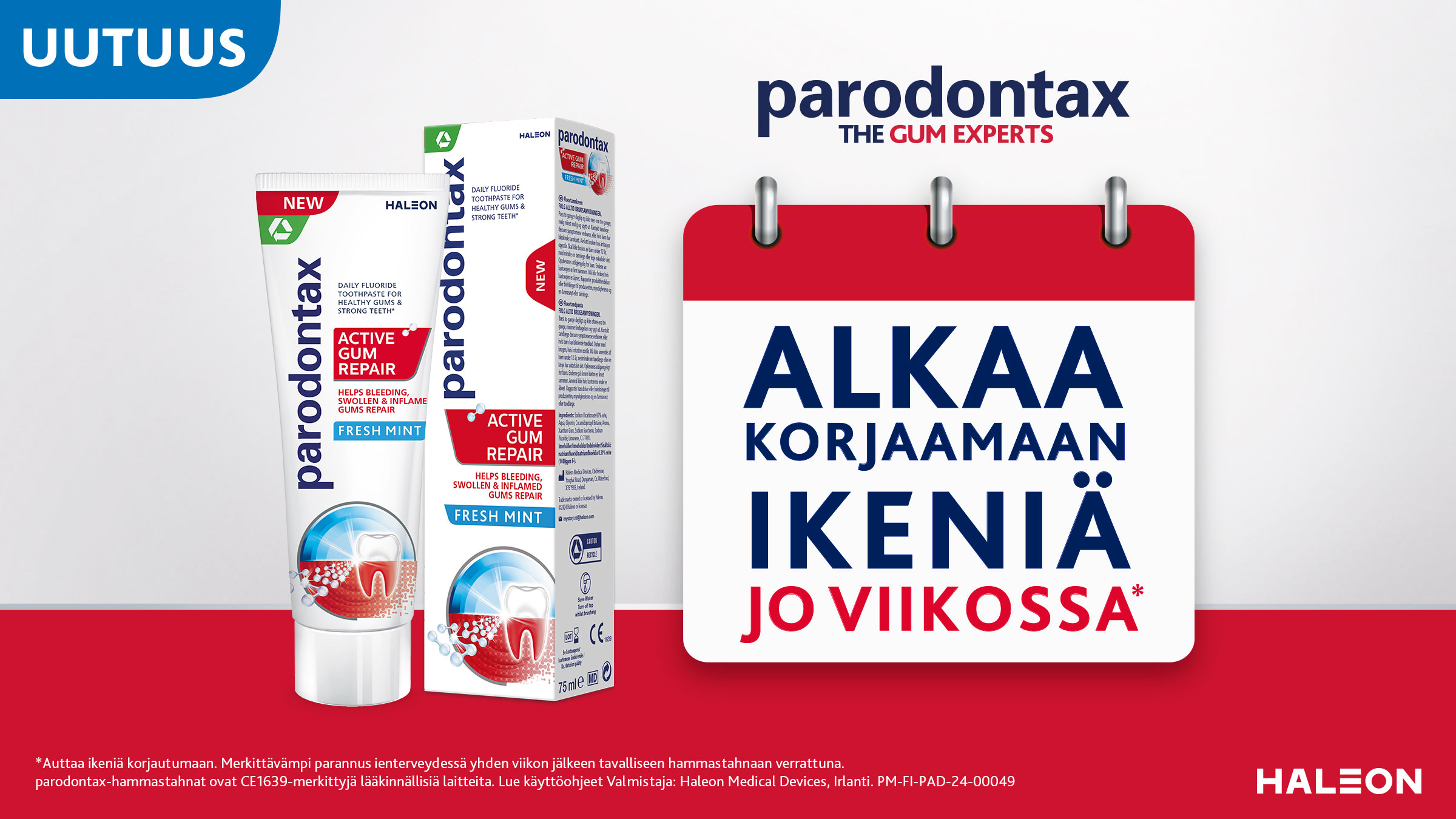 parodontax-hammastahnat ovat CE1639-merkittyjä lääkinnällisiä laitteita. Lue käyttöohjeet. Valmistaja: Haleon Medical Devices, Irlanti. PM-FI-PAD-25-00002.