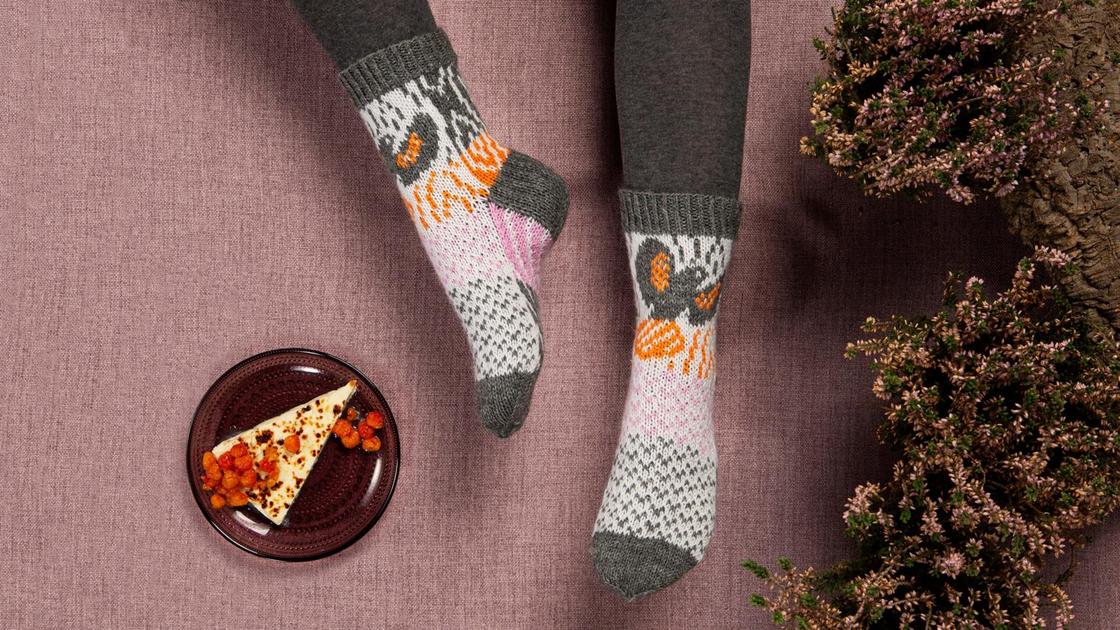 Ota puikoille Kainuun maakuntasukat, joiden varressa liihottaa retkeilijän kaverina ja onnenlintuna tunnettu kuukkeli. Sukkien jalkaterässä toistuvat maakunnan nimikkokasvi kanervan herät kellomaiset kukinnot.