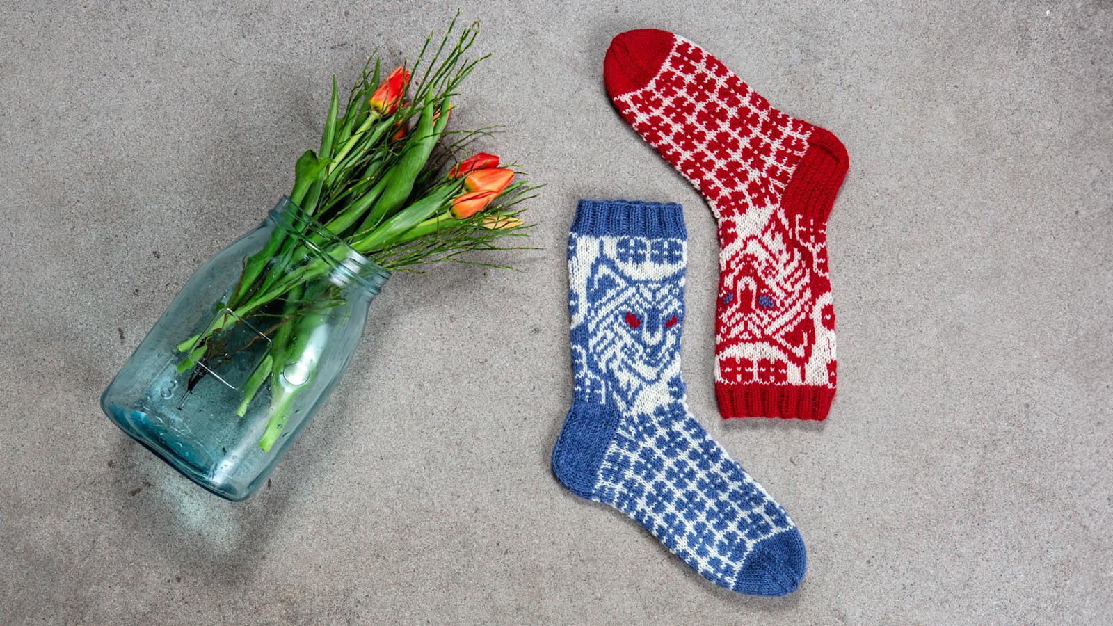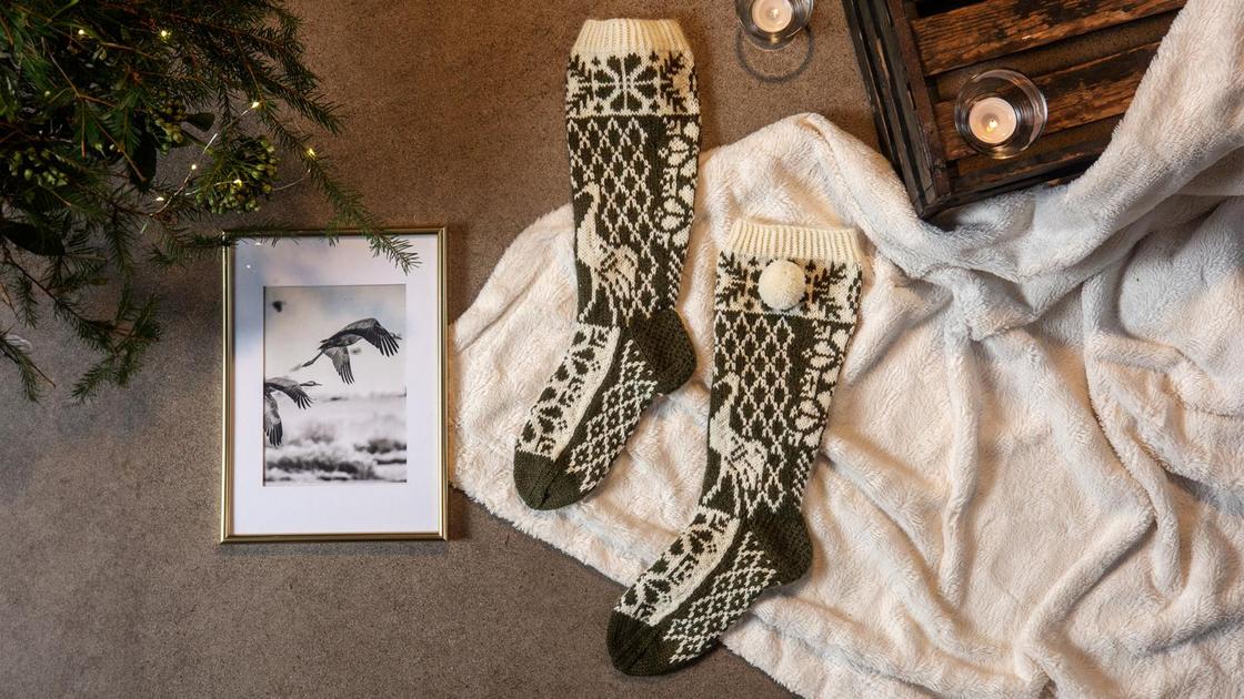 Ota puikoille komeiden kurkien ja valkokukkaisten suopursujen koristamat Pohjois-Pohjanmaan maakuntasukat. Neulo tupsuilla viimeistellyt kirjoneulesukat itselle tai kääräise lahjaksi pukinkonttiin.