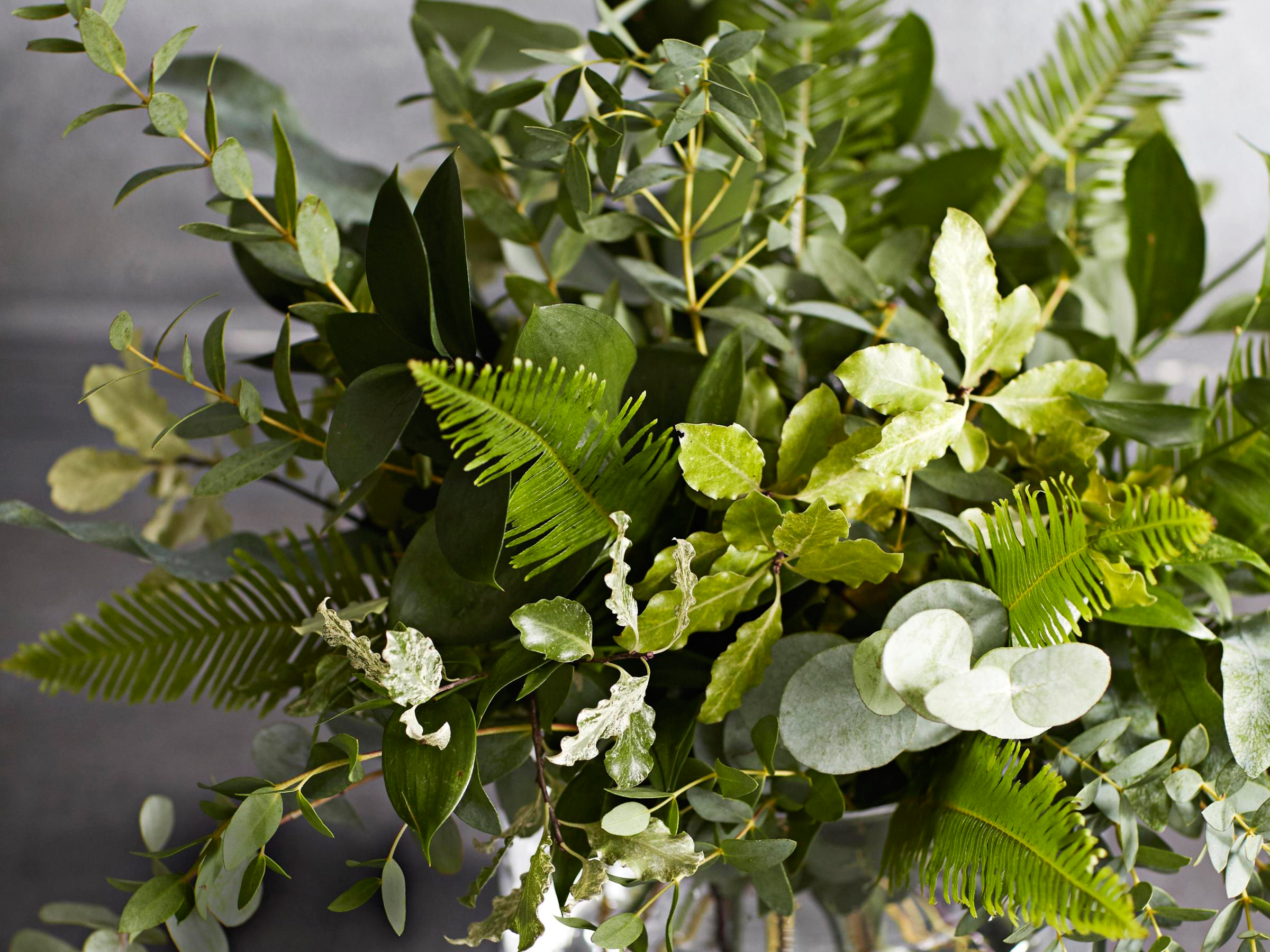 Erilaisia eucalyptyksia, ruskusta, imarretta, kielopuuta ja saniaista – kauniin kimpun voi vaihtelun vuoksi koota myös kokonaan ilman kukkia. Erilaisia leikkovihreitä on paljon, ja ne kestävät pitkään maljakossa.