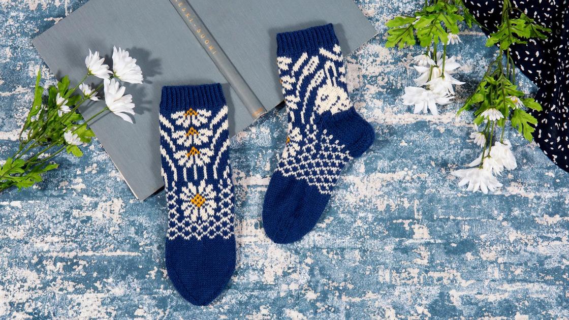 Keski-Suomen sukkia koristavat läpi kesän kukkivat päivänkakkarat, joiden seassa loikkii lystikäs metsäjänis. Katso ohje, josta löydät kaksi eri kokovaihtoehtoa.