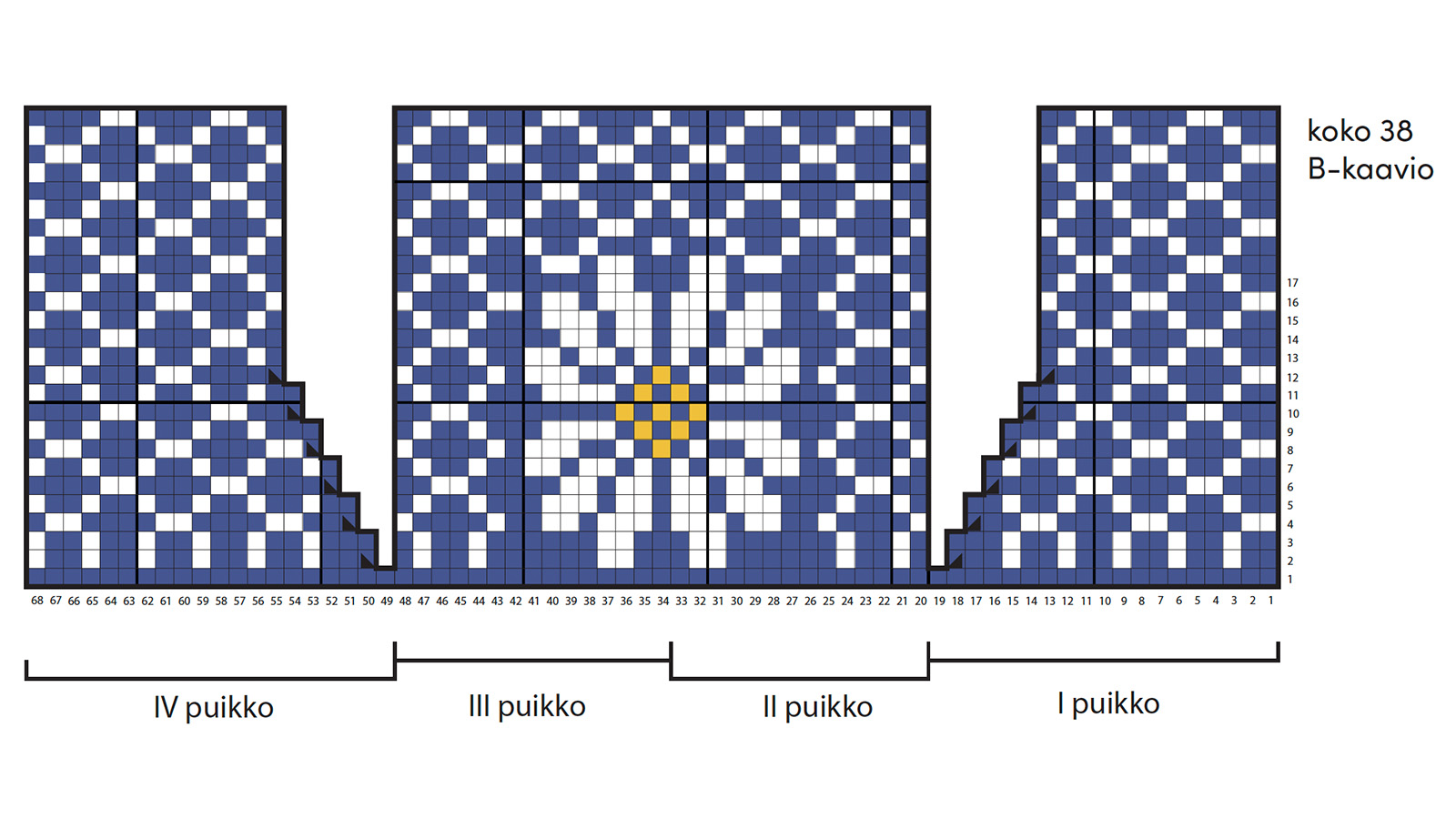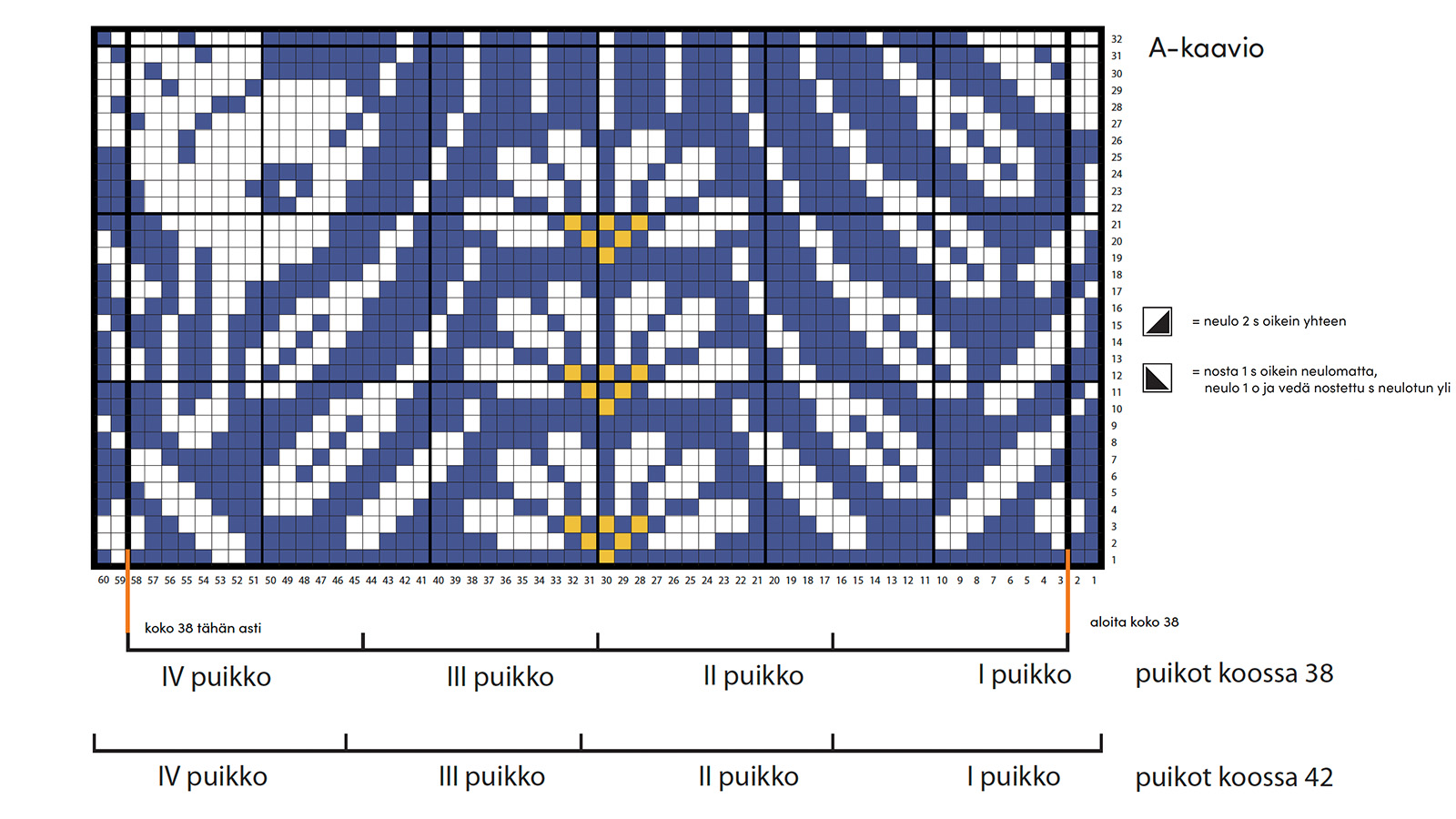 Aloita kirjoneule suljettuna neuleena A-kaavion 1. krs:lta 3. (1.) silmukasta. Neulo silmukat 3–58 (1–60). Jatka samoin kaavion loput krs:t.
