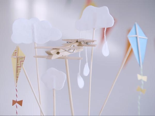 Vauhtihirmun jäätelökakkuun askarrellaan helppo lentokonekoriste pyykkipojasta, grillitikusta ja jäätelötikuista. Kakun päällä leijailevat myös valkoisesta huovasta askarrellut pehmoiset pilvet sekä erilaisista papereista, hammas- ja grillitikuista tehdyt leijat.
