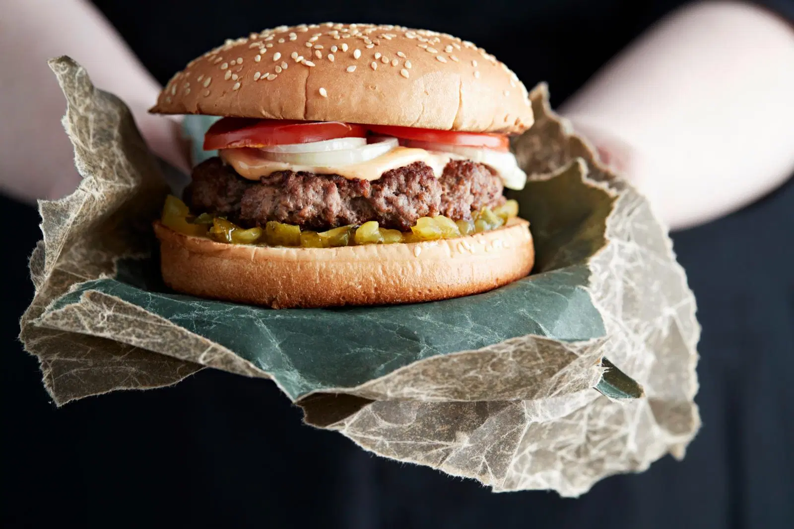 Maukkaiden hampurilaisten naudanlihapihvi maustetaan valkosipulilla ja chilillä. Kasaa sämpylöiden väliin pihvin lisäksi kasviksia, kurkkusalaattia, juustoa ja majoneesia.