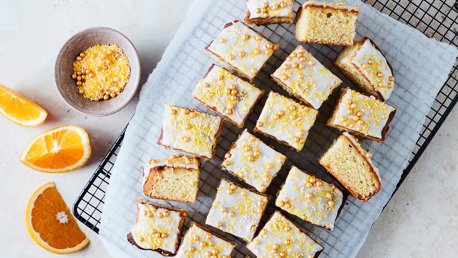 Näissä paloissa maistuu tuore appelsiini! Kostuta levykakku appelsiinimehulla ihanan meheväksi. Kuorruta herkku mokkapalojen tapaan, mutta mausta kuorrute kahvin tai kaakaon sijaan appelsiinilla.