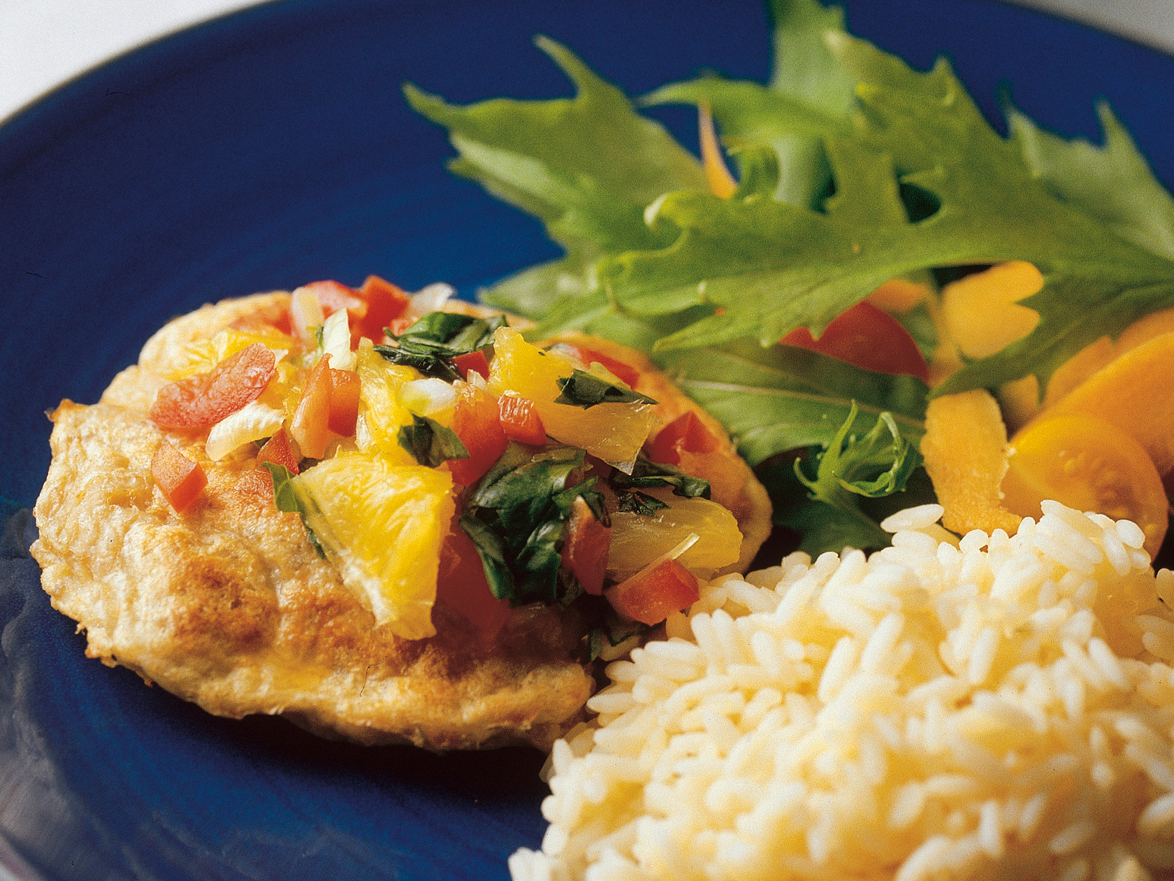 Hienonna sipuli, kuori appelsiini ja leikkaa kuutioiksi. Pese paprika, poista siemenet ja kuutioi. Hienonna basilika. Yhdistä salsan ainekset ja nosta kylmään odottamaan.