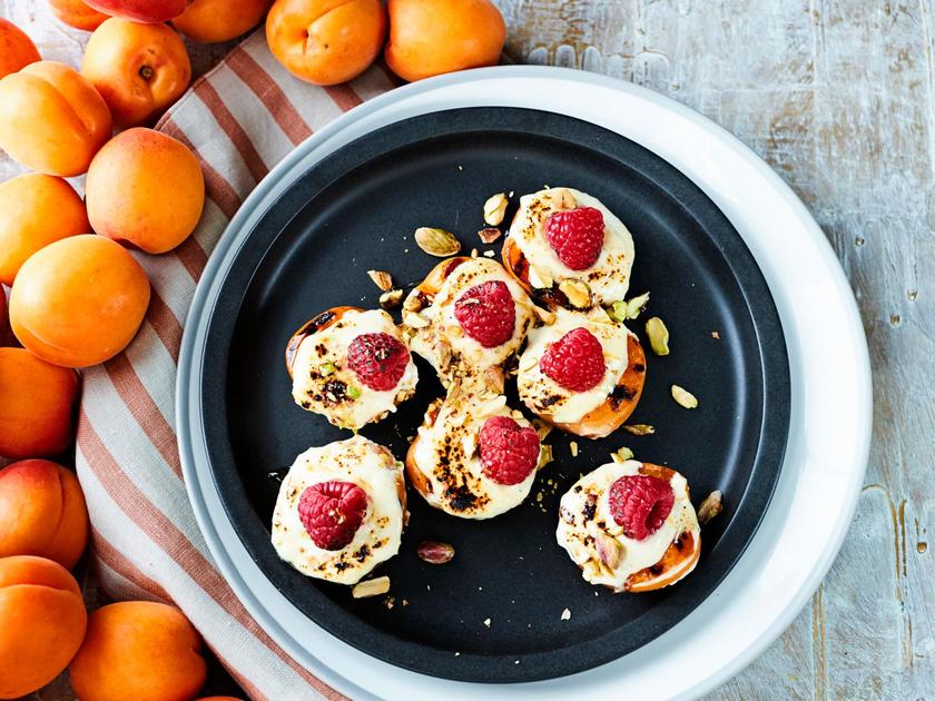 Huuhtele ja halkaise aprikoosit, poista kivi. Grillaa aprikooseja tai paista pannulla leikkuupinta alaspäin muutama minuutti, kunnes pinta hieman tummuu.