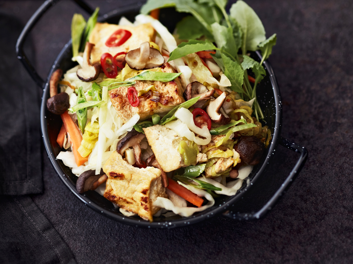 Kypsennä kasvikset puolikypsiksi wokissa koko ajan liikutellen. Mausta soijalla, riisietikalla ja sokerilla. Lisää viimeiseksi kypsät tofupalat.
