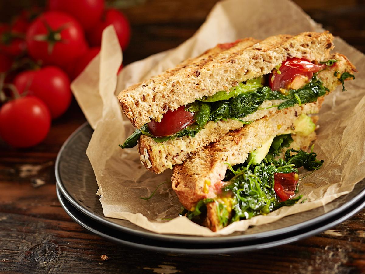 Riivi lehtikaalin paksut ruodit pois ja pilko lehdet pieniksi. Pehmennä lehtikaali halkaistujen kirsikkatomaattien kanssa pikaisesti öljyssä pannulla. Halkaise avokado, poista kivi ja lusikoi hedelmäliha leikkuulaudalle. Leikkaa lohkoiksi ja mausta sitruunamehulla, suolalla ja pippurilla. Jaa lehtikaali-tomaattiseos neljälle leipäviipaleelle. Lado pinnalle avokadoviipaleet. Nosta loput leivät päälle kansiksi ja jaa leivät kahteen osaan kolmioiksi. Paahda leivät rapeiksi voileipägrillissä tai vohveliraudalla.