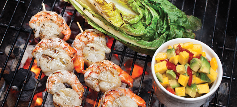 Liota varrastikut hyvin vedessä. Pujota kampasimpukat vartaisiin ja jättikatkaravunpyrstöt omiinsa. Mausta suolalla ja pippurilla. Paista kuumalla pannulla tai grillissä 1-2 minuuttia molemmin puolin. Halkaise salaatit. Älä leikkaa kantaa pois. Sivele öljyä salaatin leikkuupintaan ja grillaa siihen kaunis pinta. Asettele vartaat grillatun salaatin päälle, tarjoa valkosipulimajoneesin ja avokado-mangosalsan kanssa.