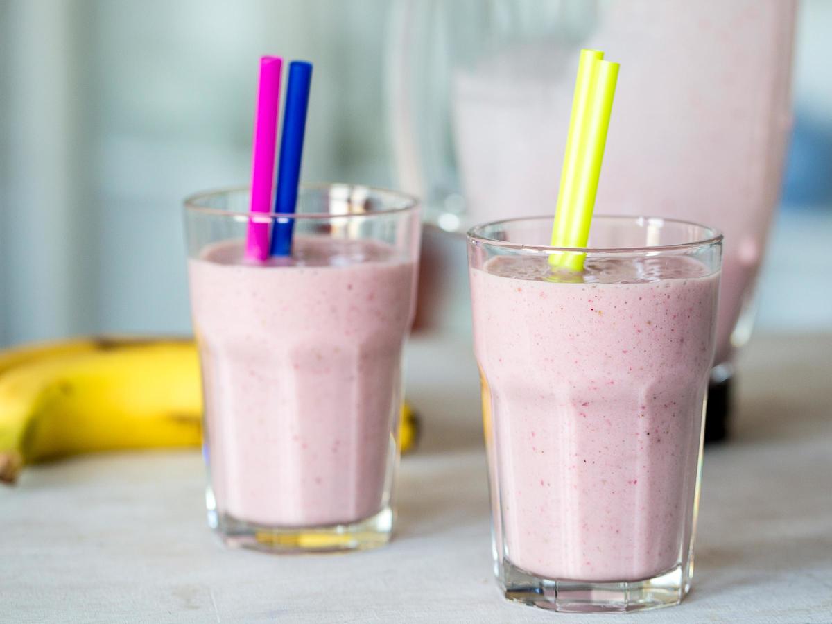 Maidosta, banaanista ja mansikoista syntyy helppo välipalapirtelö. Makeuta hunajalla ja vaniljasokerilla.