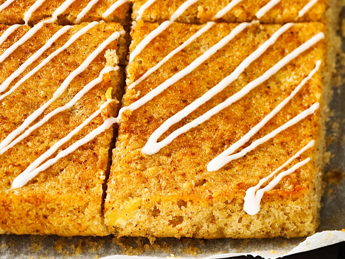 Vaahdota rasva ja sokeri. Lisää munat yksitellen, voimakkaasti vatkaten. Sekoita kuivat aineet keskenään. Kuori ja murskaa banaanit haarukalla soseeksi. Lisää rasva-munaseokseen kuivat aineet, banaanisose ja kerma ja kääntele tasaiseksi seokseksi.Levitä taikina leivinpaperoidun noin 25 x 35 sentin kokoisen uunivuoan tai -pellin pohjalle. Paista piirakkaa 175-asteisessa uunin keksitasossa noin 35 minuuttia. Nosta piirakka jäähtymään ritilän päälle. Leikkaa piirakka paloiksi ja koristele sokerikuorrutteella.